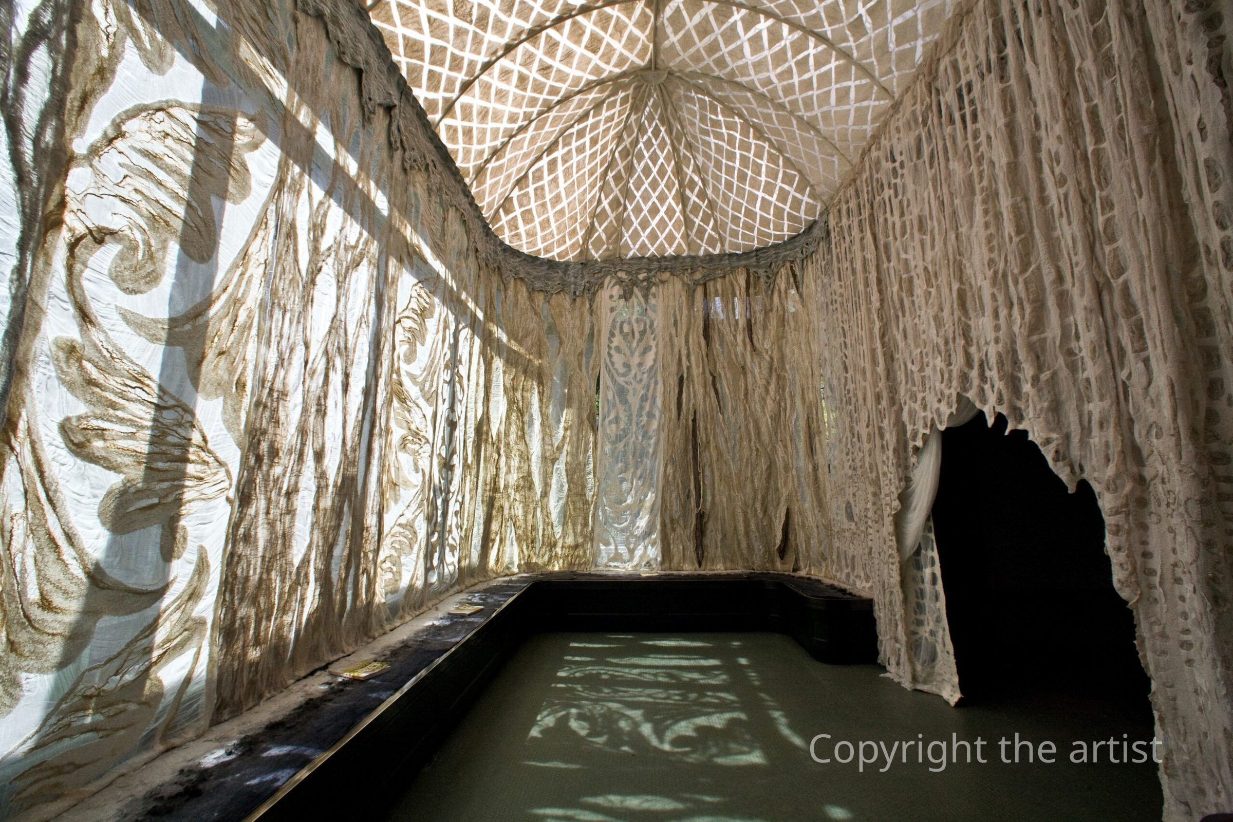 wool, linen, silk, jute, recycled coffee bags, metal- felted