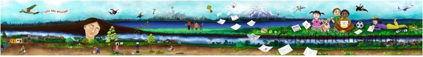 Displayed at the Gina Marie Lindsay Hall in SeaTac. Mural sponsored by The Bezos Family Foundation, Students Rebuild in partnership with UNICEF and Alaska Airlines.