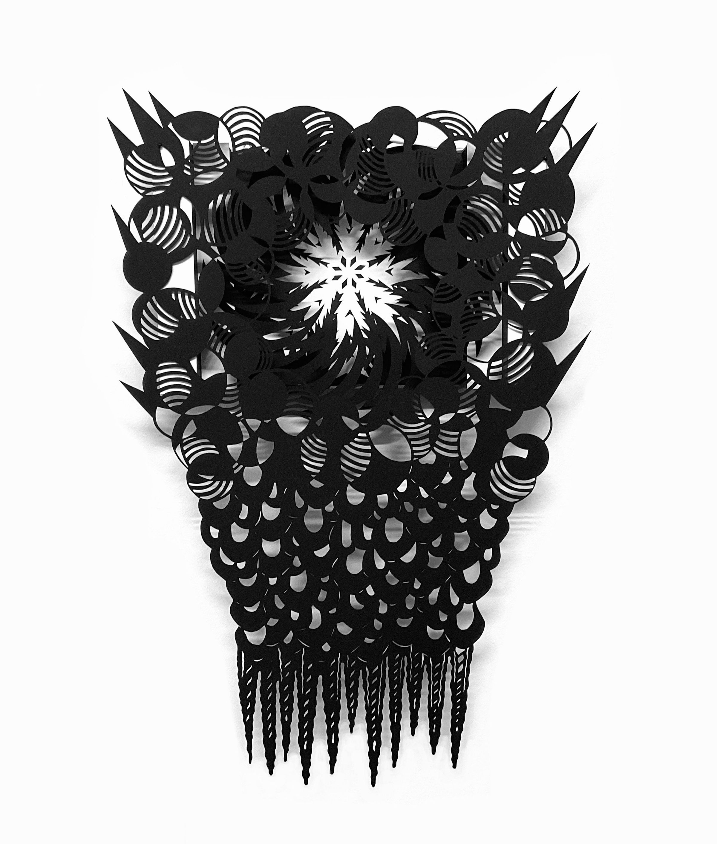 This piece is an unframed wall diorama that comes in three pieces that hang on top of each other. It should take less than an hour for one person to install. Photographic directions of how the layers are attached will be included with the work. Locations for attaching layers are identified on the bottom frame support and the back of each layer. Included is a single white nail for hanging. The paper is very delicate at the edges and is very light weight.
