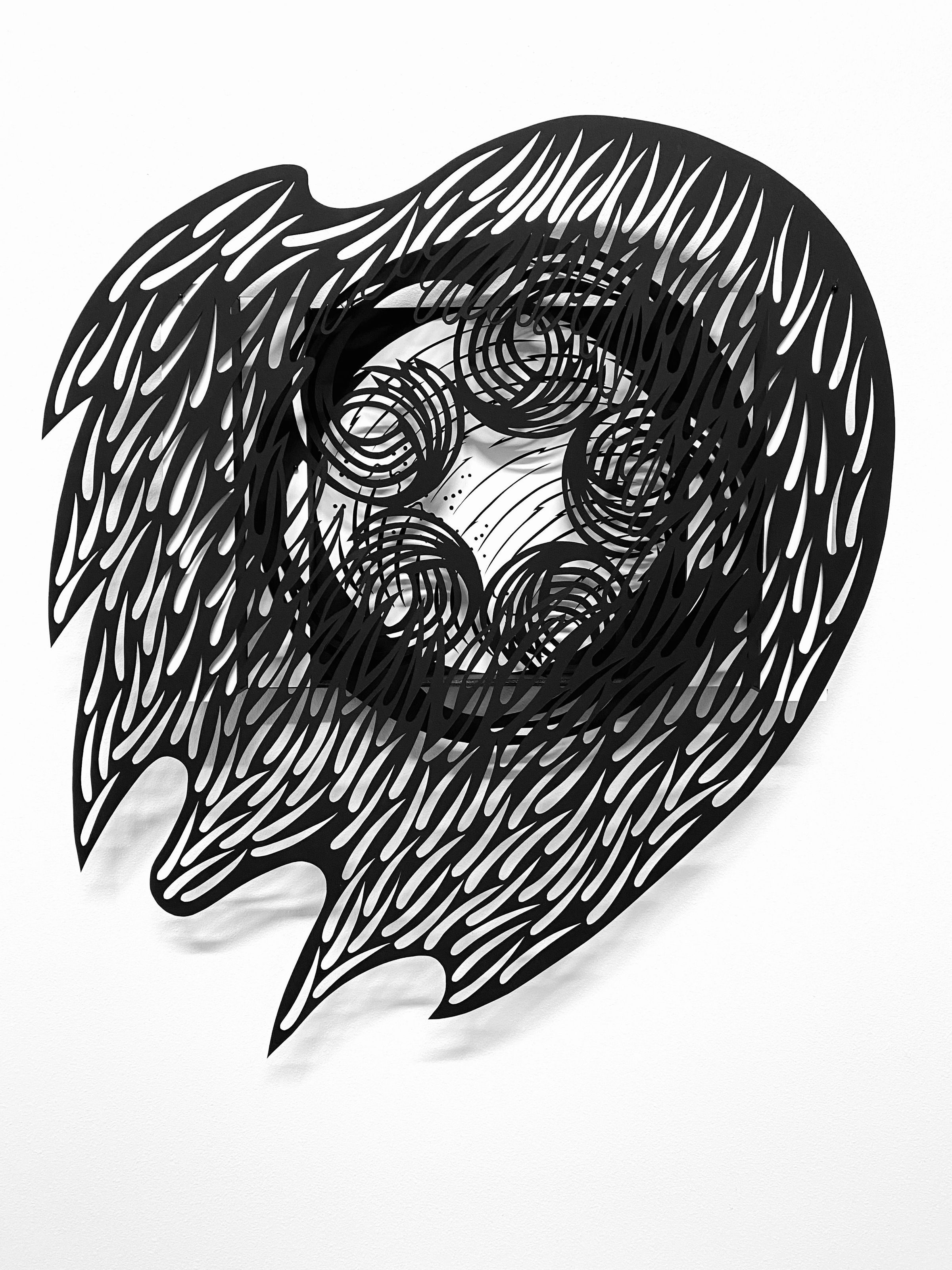The piece is an unframed wall diorama that comes in three pieces that hang on top of each other. It should take less than an hour for one person to install. Photographic directions of how the layers are attached will be included with the work. Locations for attaching layers are identified on the bottom frame support and the back of each layer. Included is a single white nail for hanging. The paper is very delicate at the edges and is very light weight.
