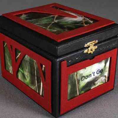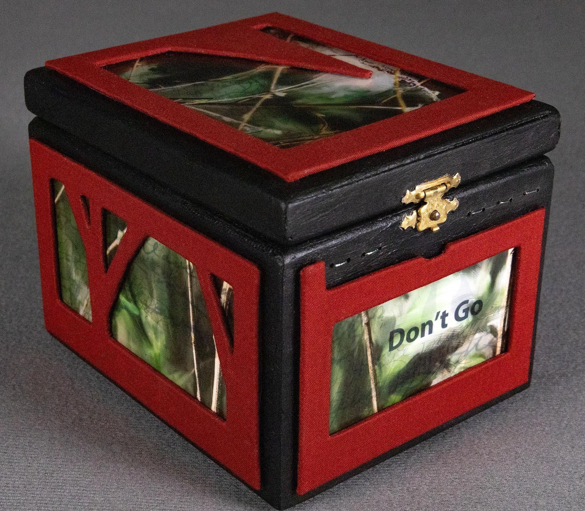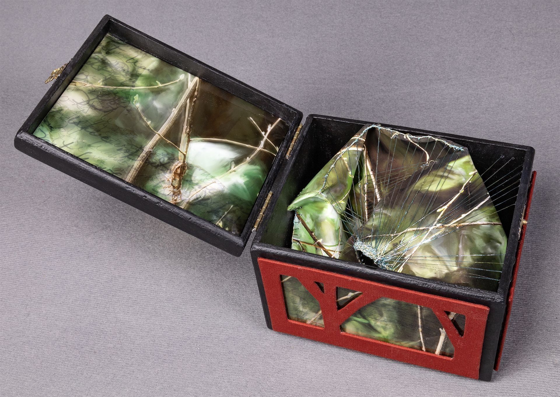 Artist book (found box with photos on transparent film; crushed print on paper; stitching with a variety of threads; binder’s board, binder’s cloth