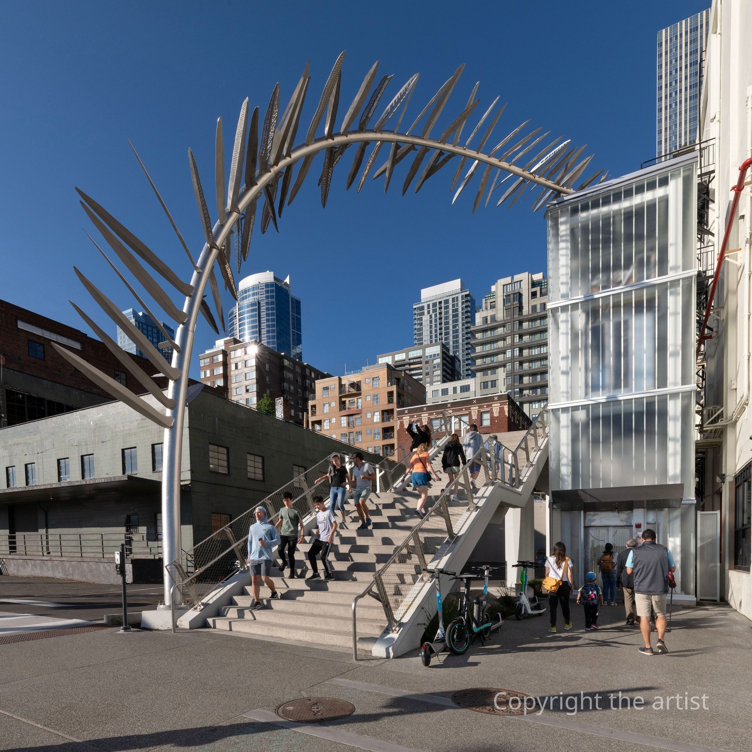 A two-part artwork based on the persistence, resilience of nature and how nature can often break through the built environment in a show of tenacity and strength. Nature’s patterns, shapes and systems relate to each other in unpredictable ways. This artwork looks at the different associations that could be made ‘where nature bumps up against the man-made. But often, nature has a way of “breaking through” despite how we try to shape and control our environment. This artwork consists of a long art screen wall and a tall sculpture that hugs and protects while celebrating nature along Seattle’s waterfront.Note