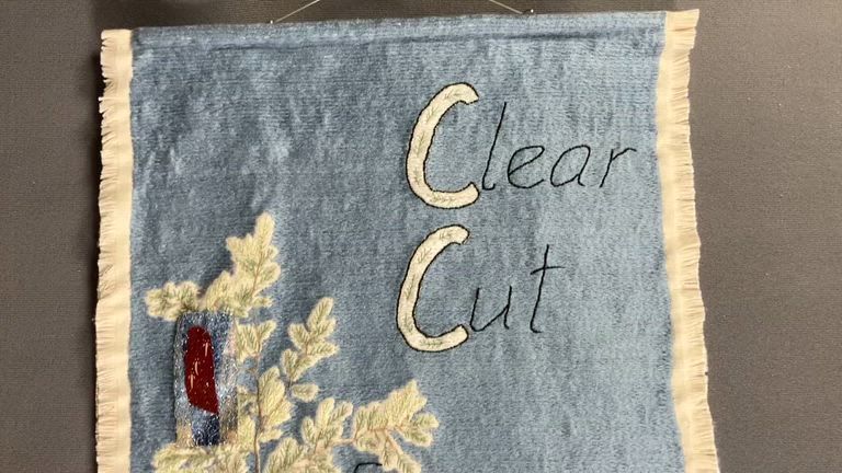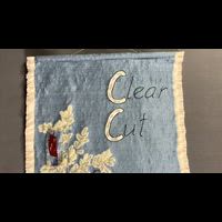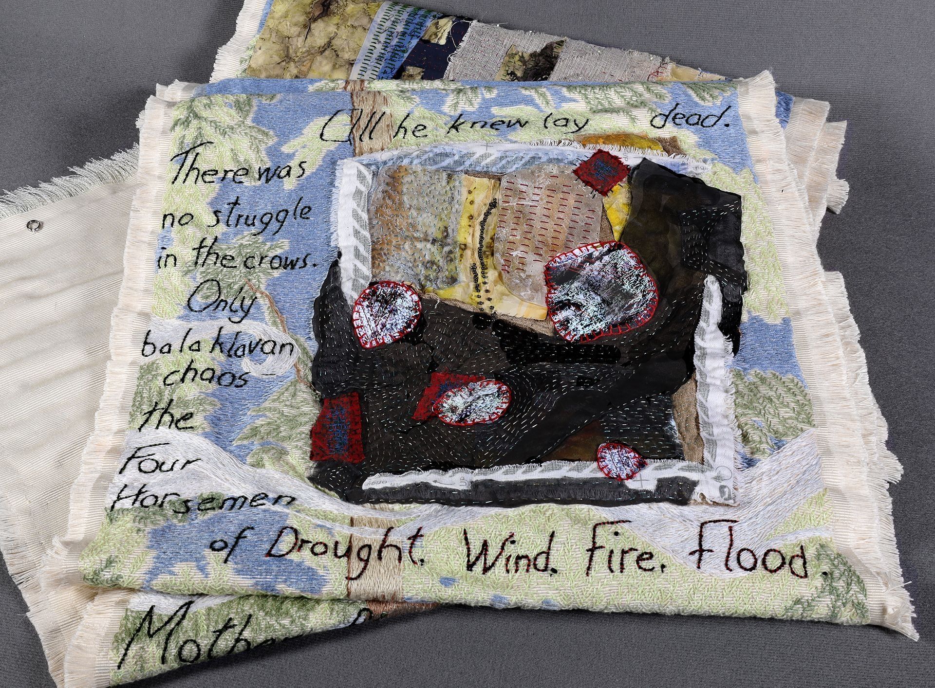 A) Accordion folds marked by internal dowels help this book fold into nine pages each marked by an embedded fabric/paper collage each of which suggested text to the artist. The resultant story reveals the artist’s feelings when witnessing clear cut in the land of timber and the question of what one person can do in what seems like hopeless times.