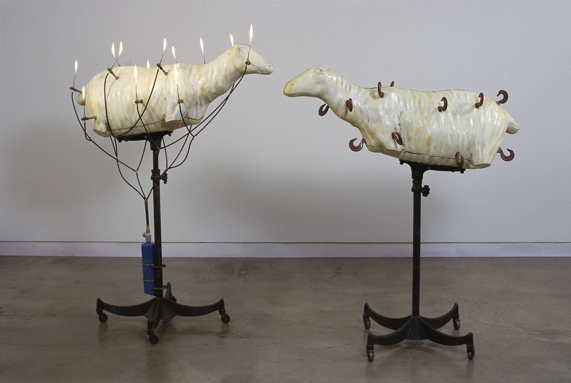 There will be no flames, a completely empty tank will be provided. The two goats are on wheels and may be displayed together in different configurations