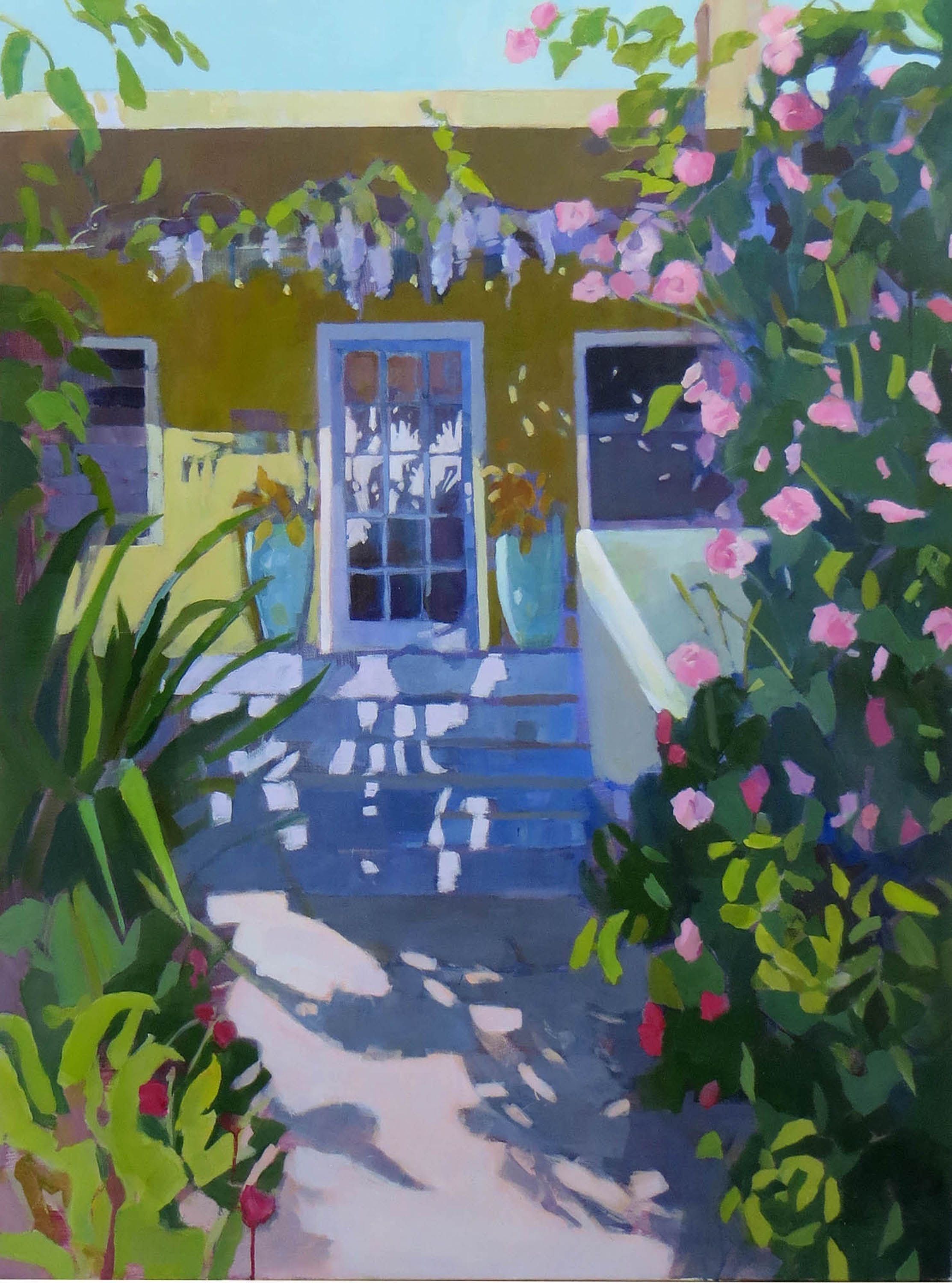 This painting was inspired by one of my afternoon neighborhood walks. I was captivated by the welcoming front porch with roses in bloom and sunlight splashing across the entryway.