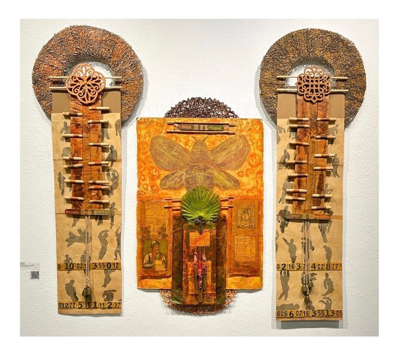 The steles (left and right pieces) and centerpiece should be spaced by 15” between them.