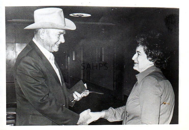 Original, negative and copy of photograph of Fred Rush and Norma Patterson at Bozeman Park School as Mr. Rush makes a $500 donation to the school. Mr. Rush ws Commander of the Union County Sheriff's Department Mounted Patrol.Collection