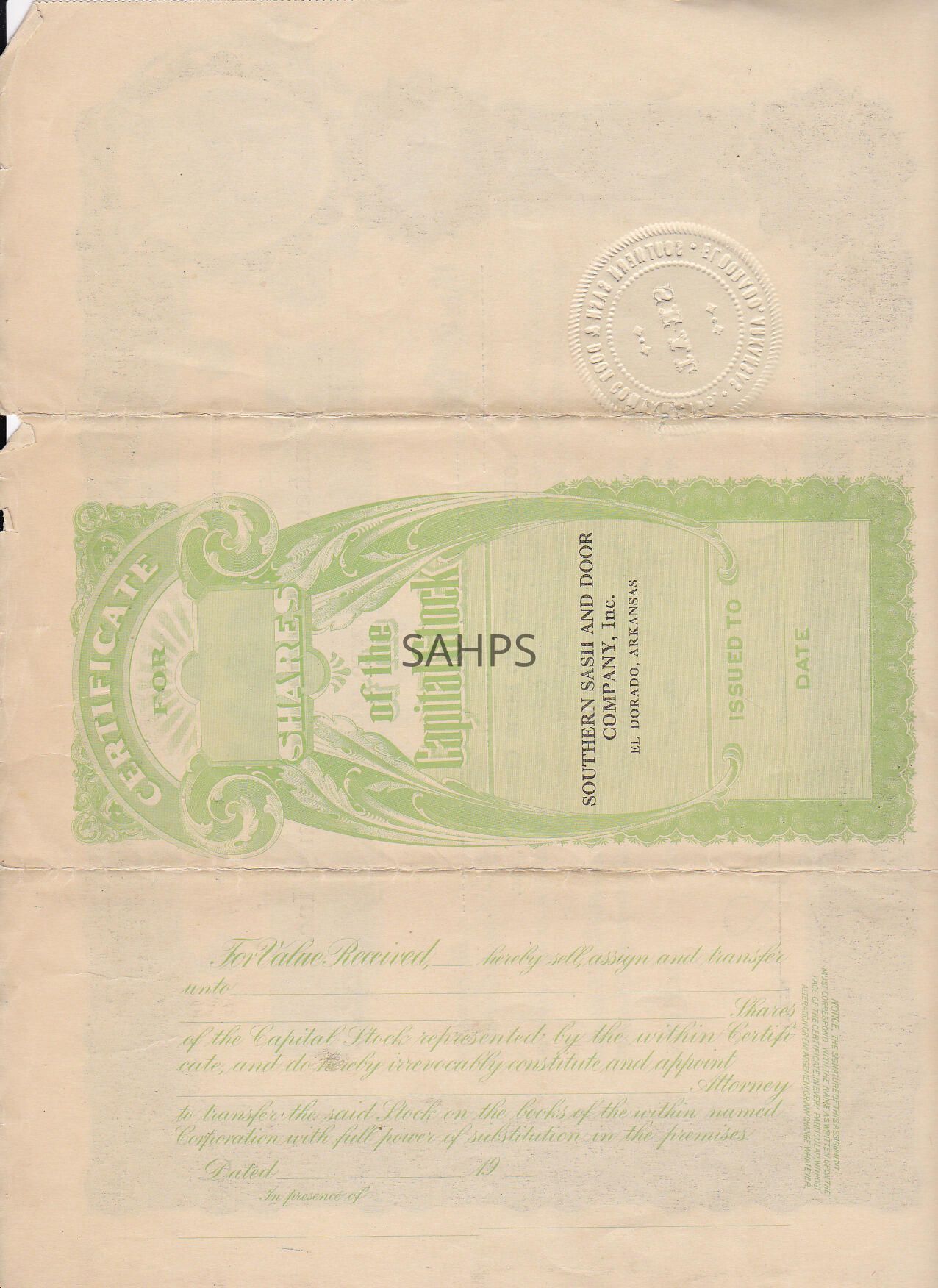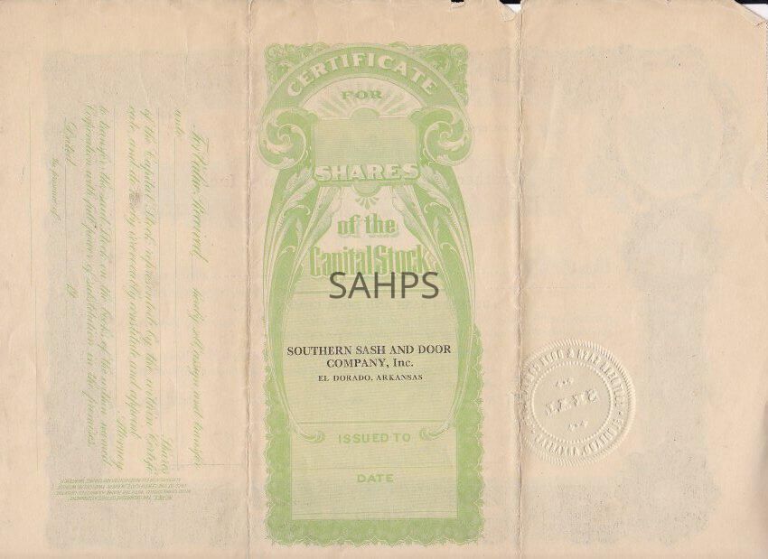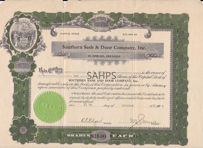 Stock Certificate for 1 share in Southern Sash and Door, Inc. of El Dorado, Arkansas. Owner: R. E. Edgar, Trustee.Collection