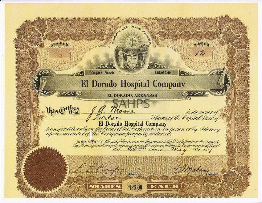 El Dorado Hospital Stock Certificate 1Entry/Object ID