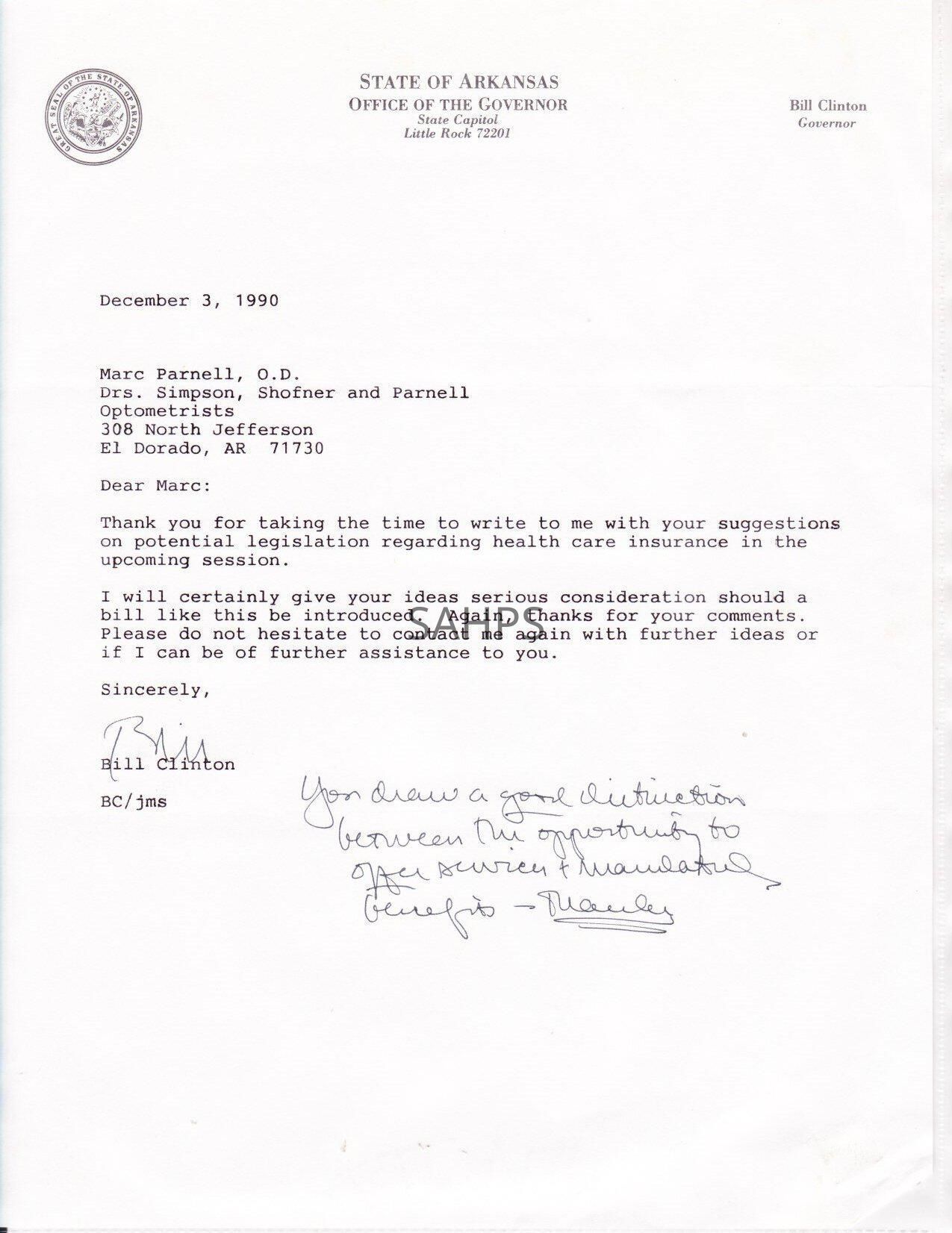 Letter from Gov. Bill Clinton to Marc Parnell, O.D. Dec. 3, 1990