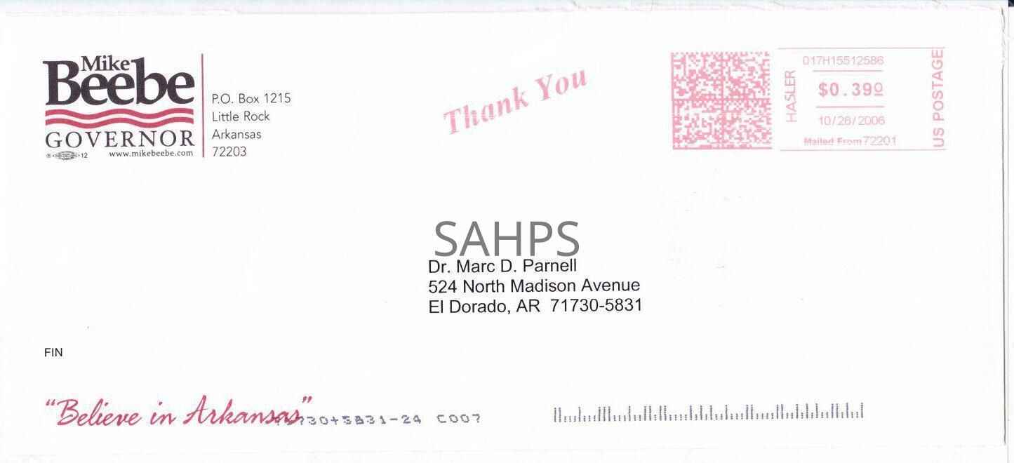Letter from Mike Beebe to Dr. Marc Parnell Oct. 26, 2006 includes envelope
