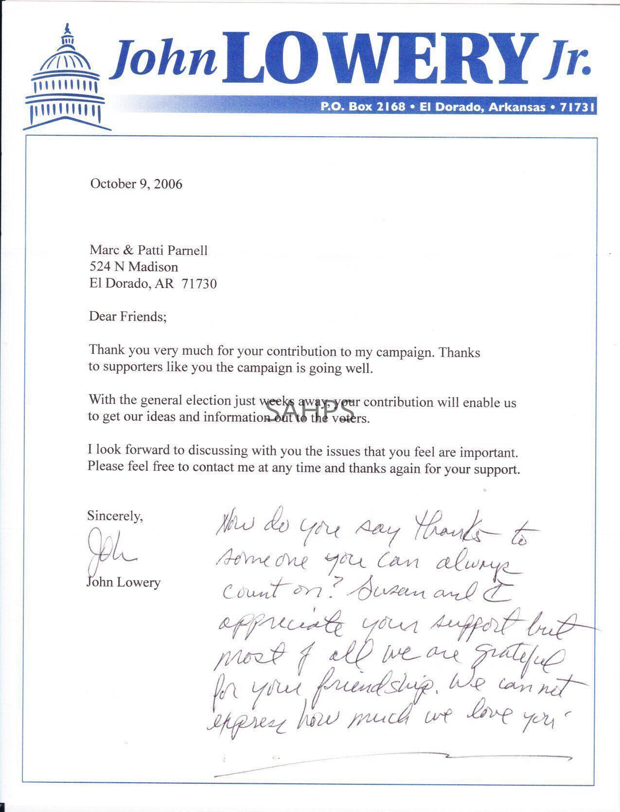 Letter from John Lowery Jr. to Dr. Marc Parnell and Patti Parnell Oct. 9, 2006 includes envelope