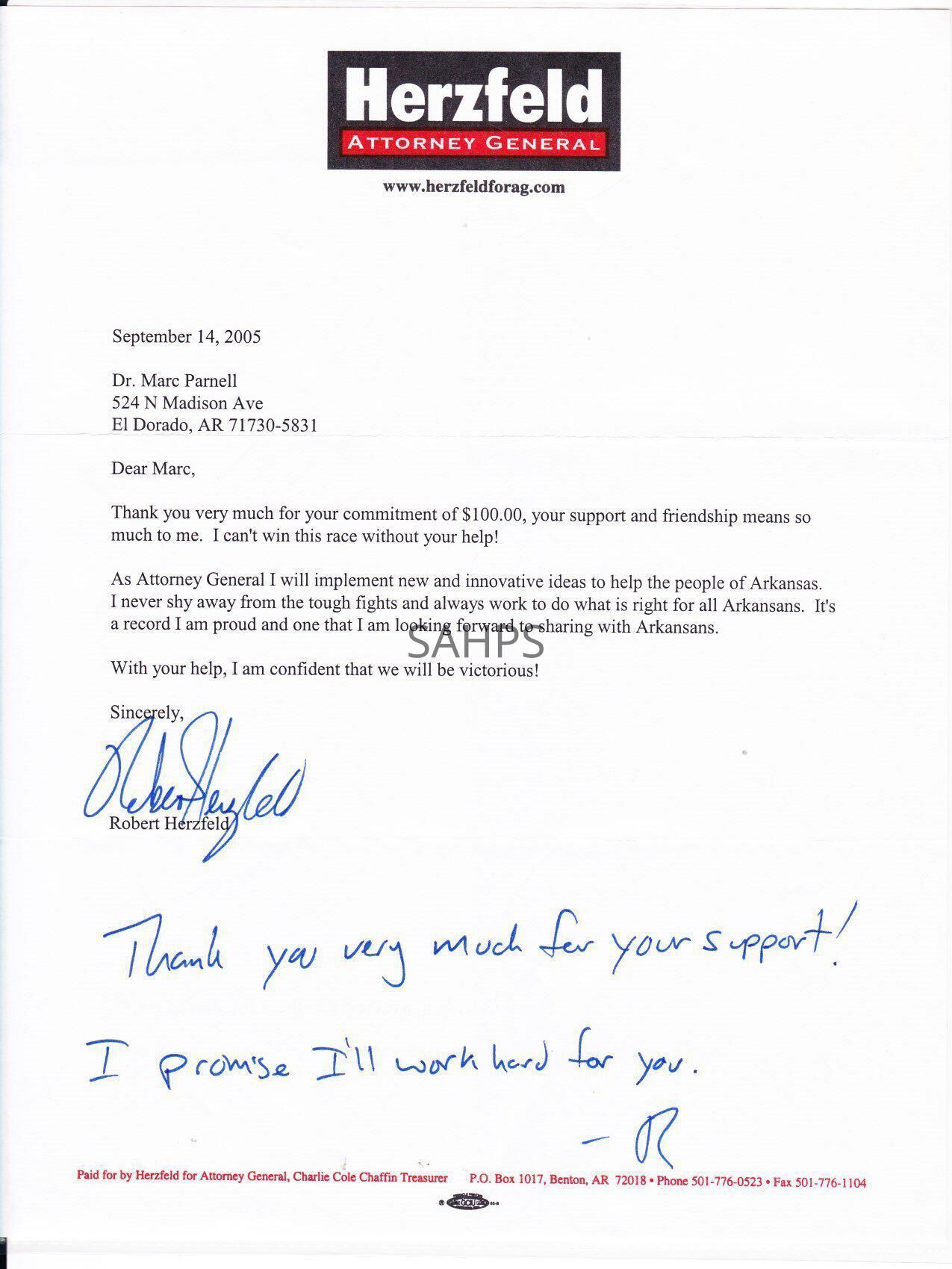 Letter from Robert Herzfeld to Dr. Marc Parnell Sept. 14, 2005 includes envelope