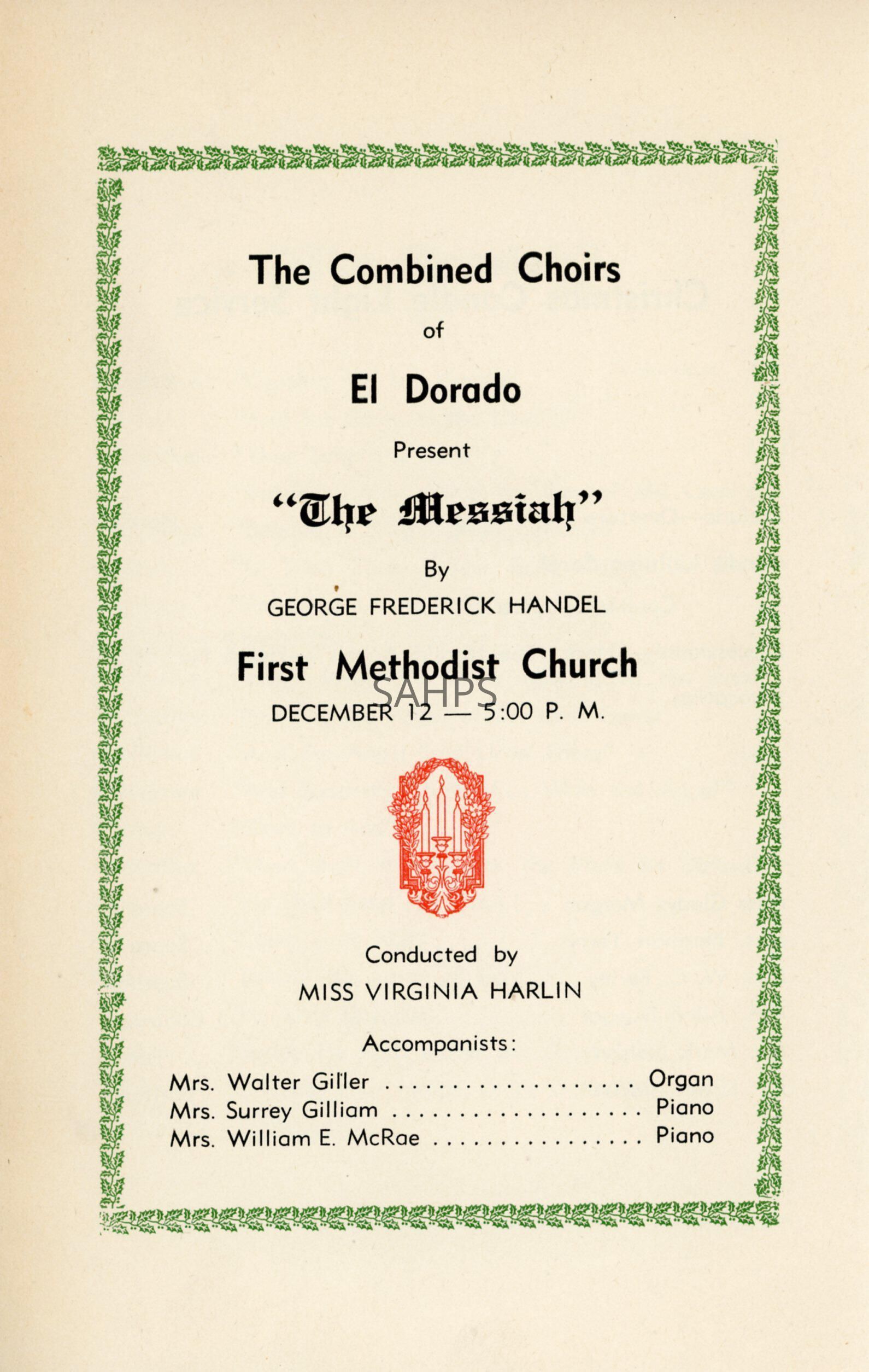 Program for The Combined Choirs of El Dorado Present "The Messiah" by George frederick Handel. First Methodist Church - December 12--5:00p.m.Collection