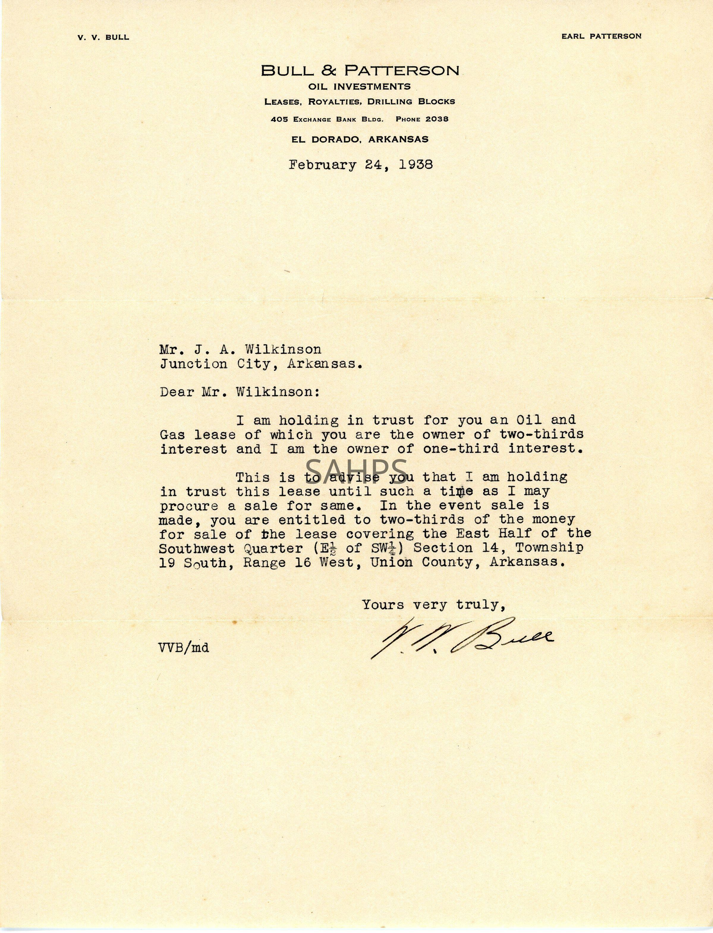Letter to J.A. Wilkinson from V.V. Bull of Bull & Patterson Feb. 24, 1938