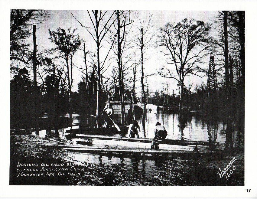 image of men on rafts loading pipeline sections/supplies to cross Smackover Creek. #1600. Loading oil field supplies to cross Smackover Creek, Smackover, Ark. Oil Field.Collection