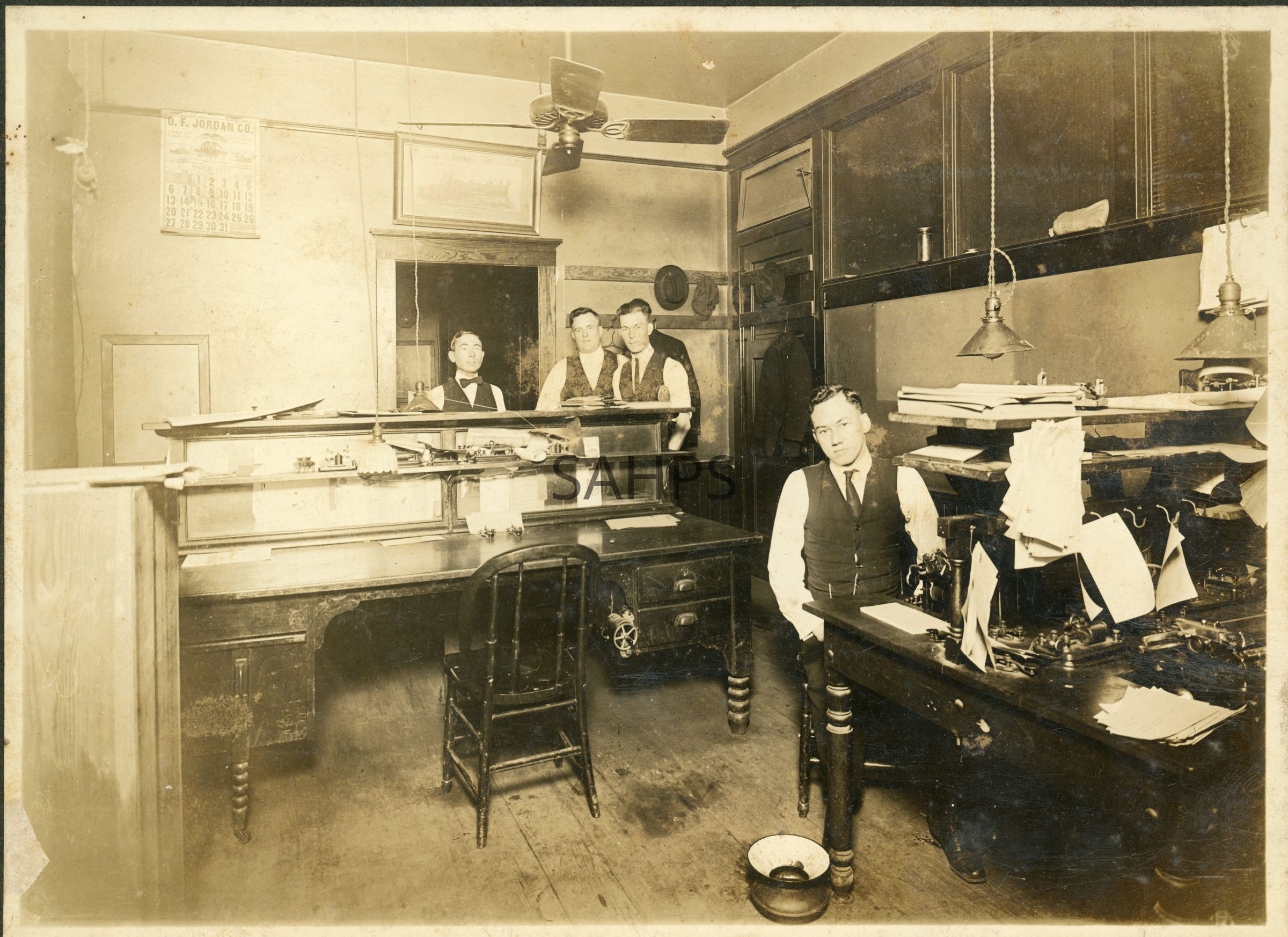 Dec. 19, 1921 photo of the interior of the Rock Island RR telegraphy office in El Dorado; donor is the granddaughter of J. Hayes in the photo