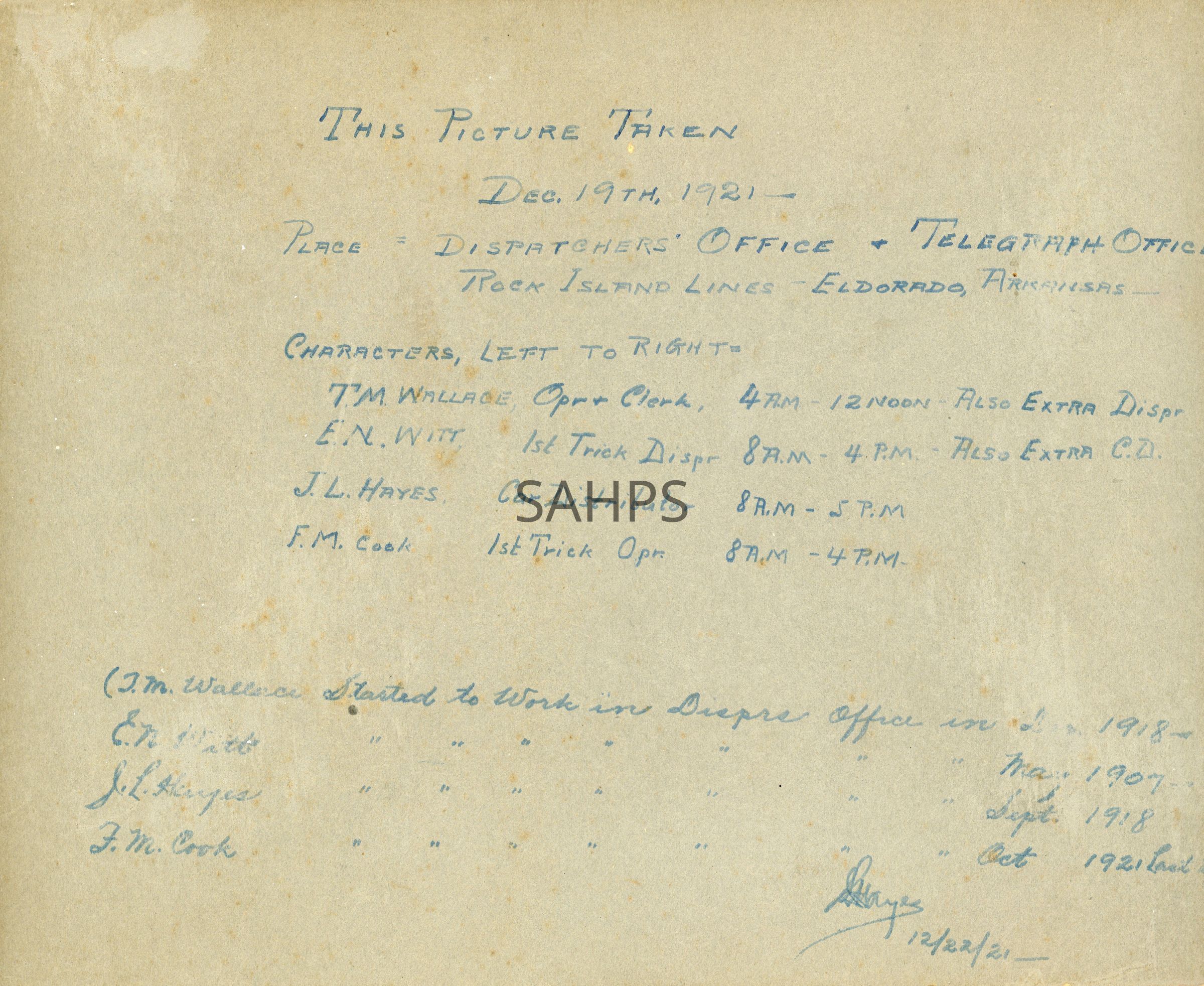 Chicago, Rock Island, and Pacific Railroad Telegraphy Office in El Dorado, AR on 12/19/1921Entry/Object ID