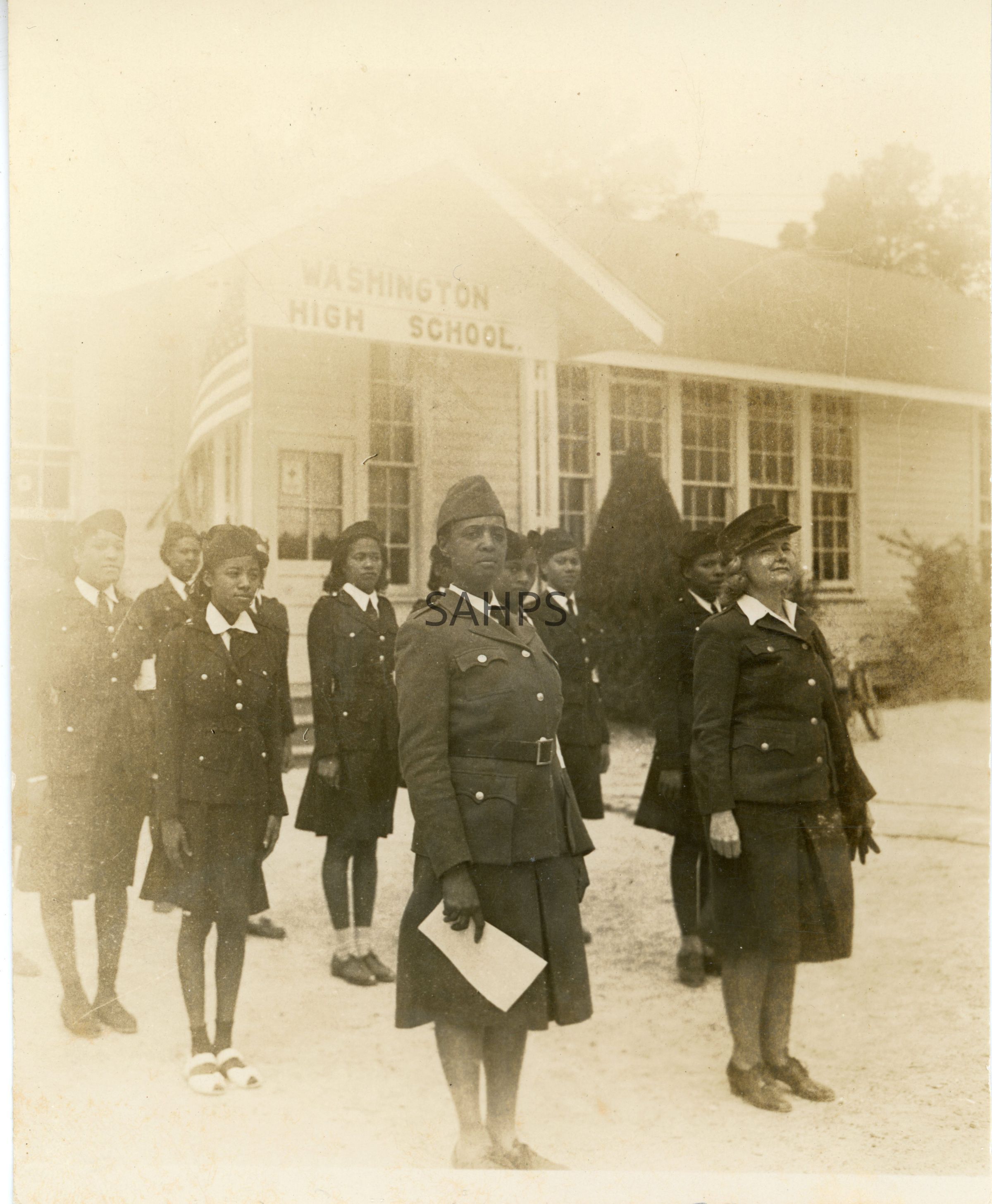 Civil Defense Messenger Corp Photograph in front of Washington High School