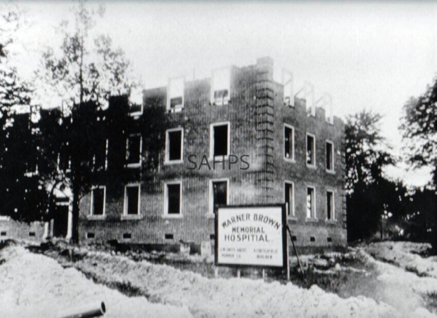 Copy of 1919 photograph of the construction of Warner Brown Memorial Hospital. J. W. Swift, Architect, B. Crutchfield, Builder. In black metal frame.Collection