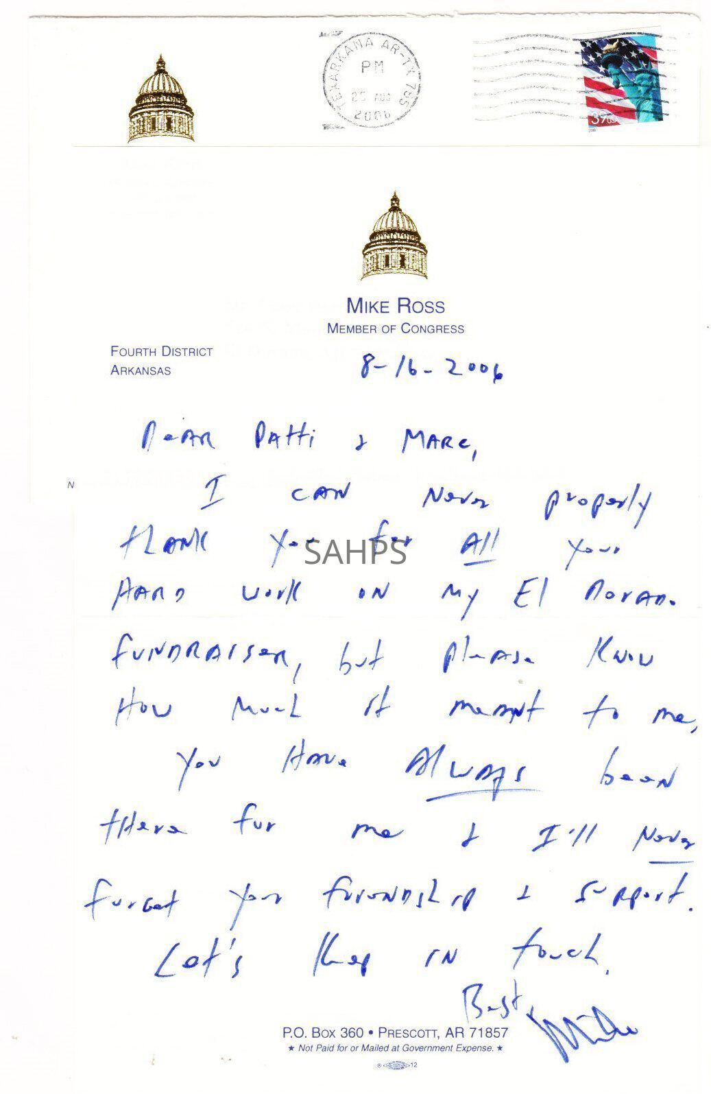 Letter from Mike Ross to Dr. Marc Parnell and Patti Parnell Aug. 16, 2006 includes envelope