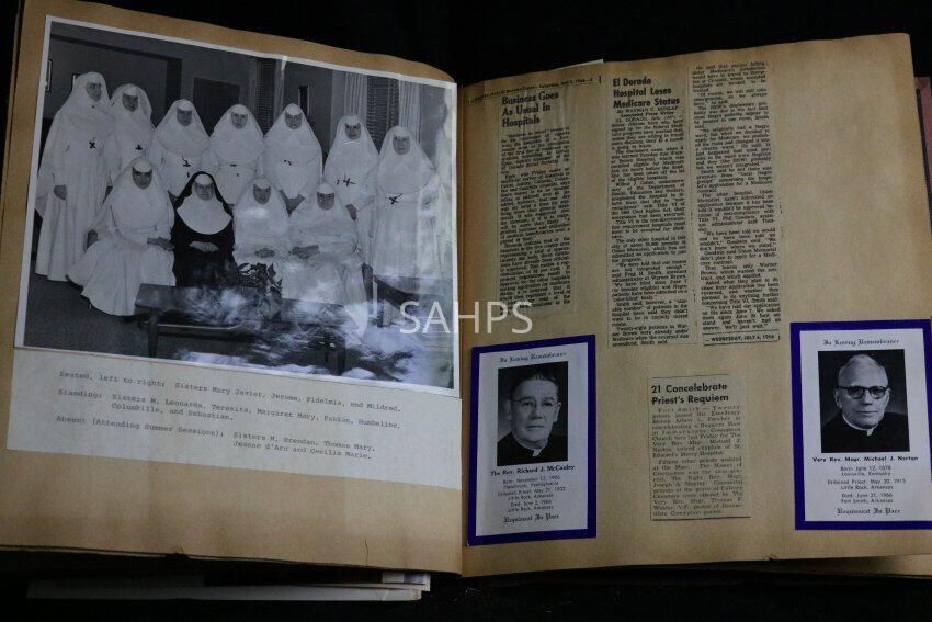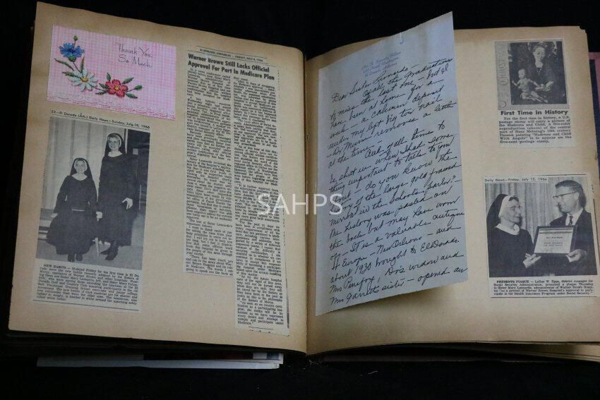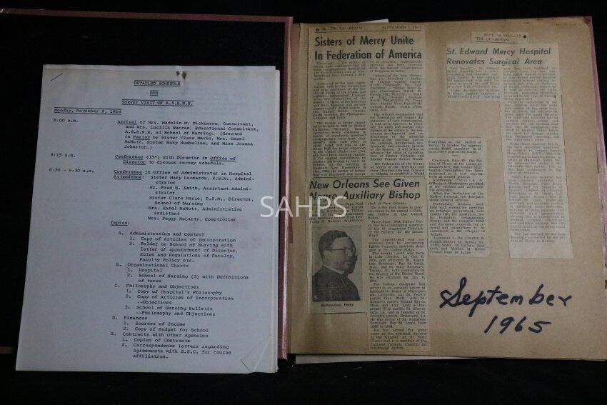 Scrapbook of Sisters of Mercy at Warner Brown Hospital in 1965. Contains clippings, announcements, and photos.