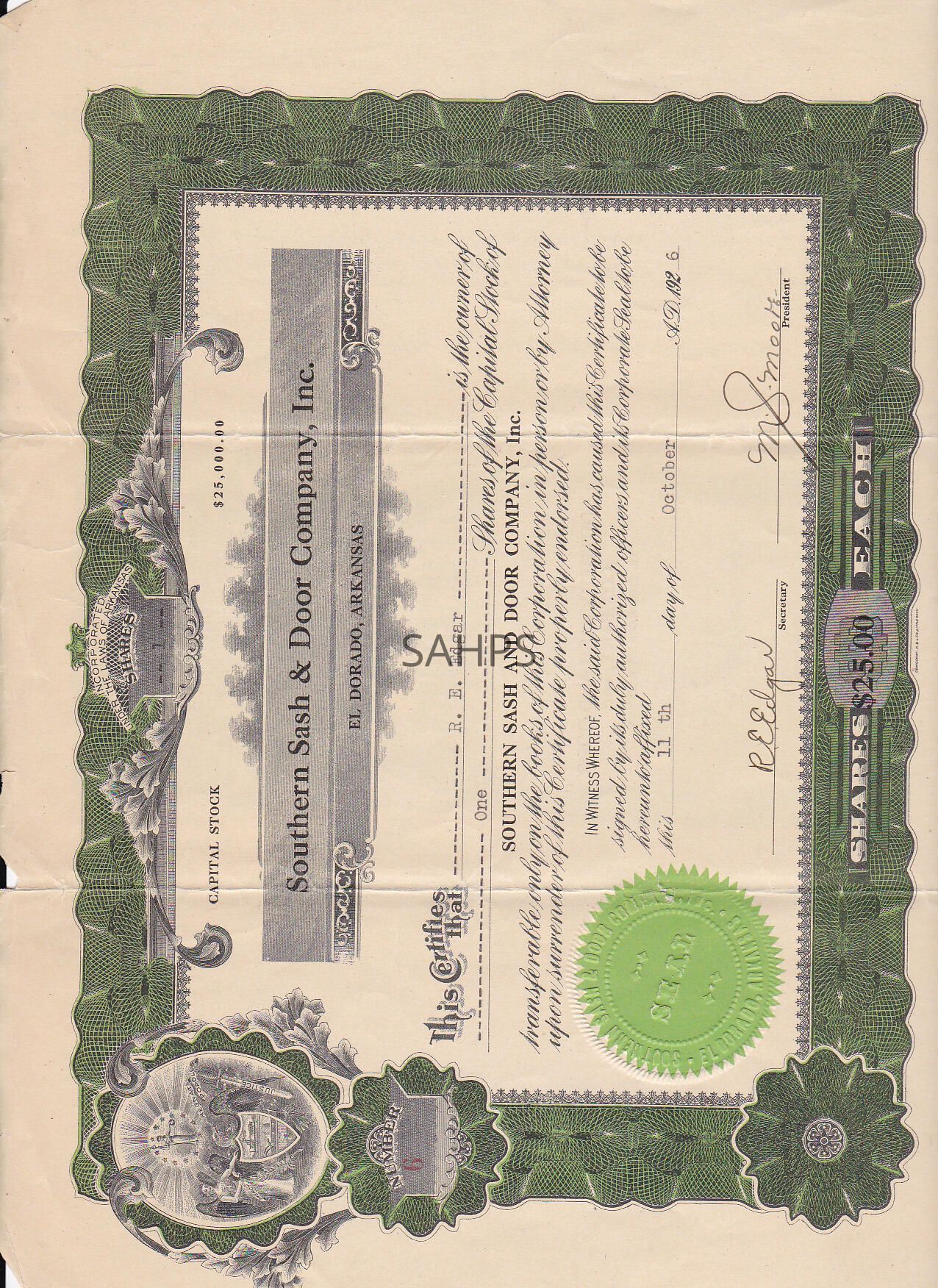 Stock Certificate for 1 share in Southern Sash and Door, Inc. of El Dorado, Arkansas. Owner: R. E. Edgar, Trustee.Collection