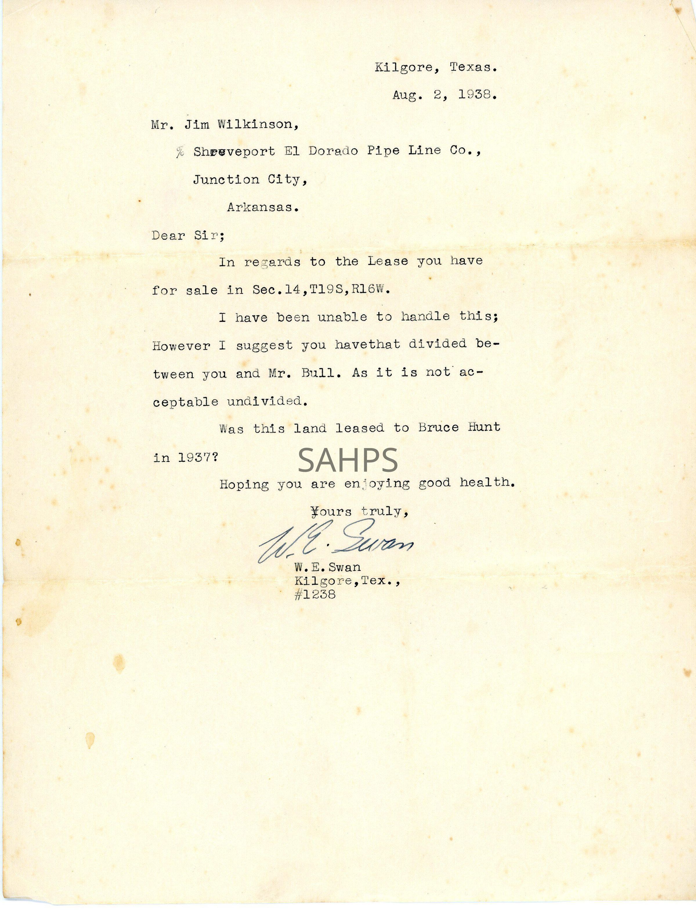 Letter to Jim Wilkinson from W.E. Swan Aug. 2, 1938