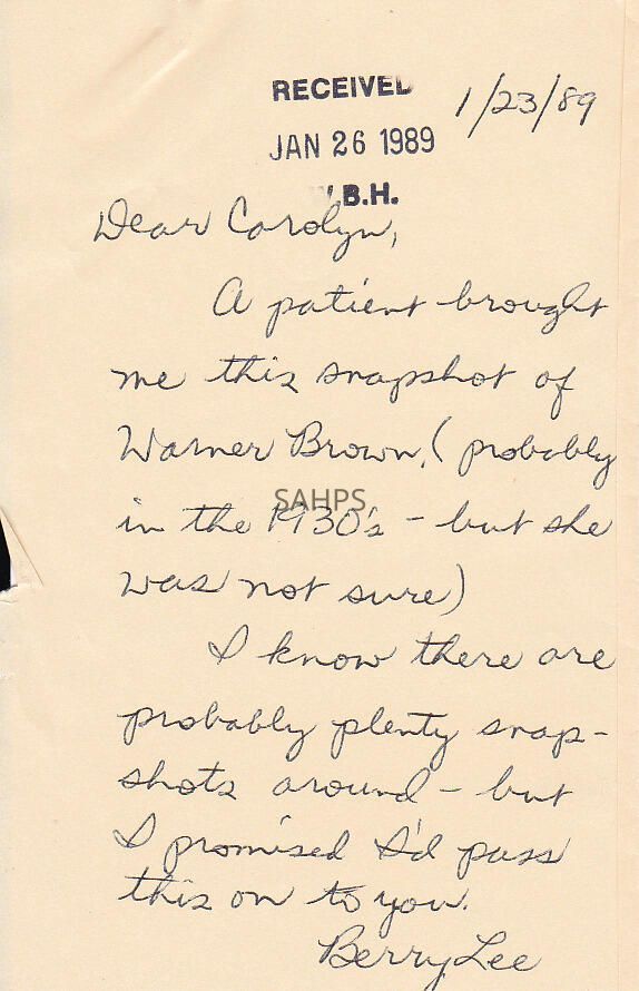 A snapshot of Warner Brown Hospital in the 1930's. A note accompanies written in 1989 from Berry Lee.Collection