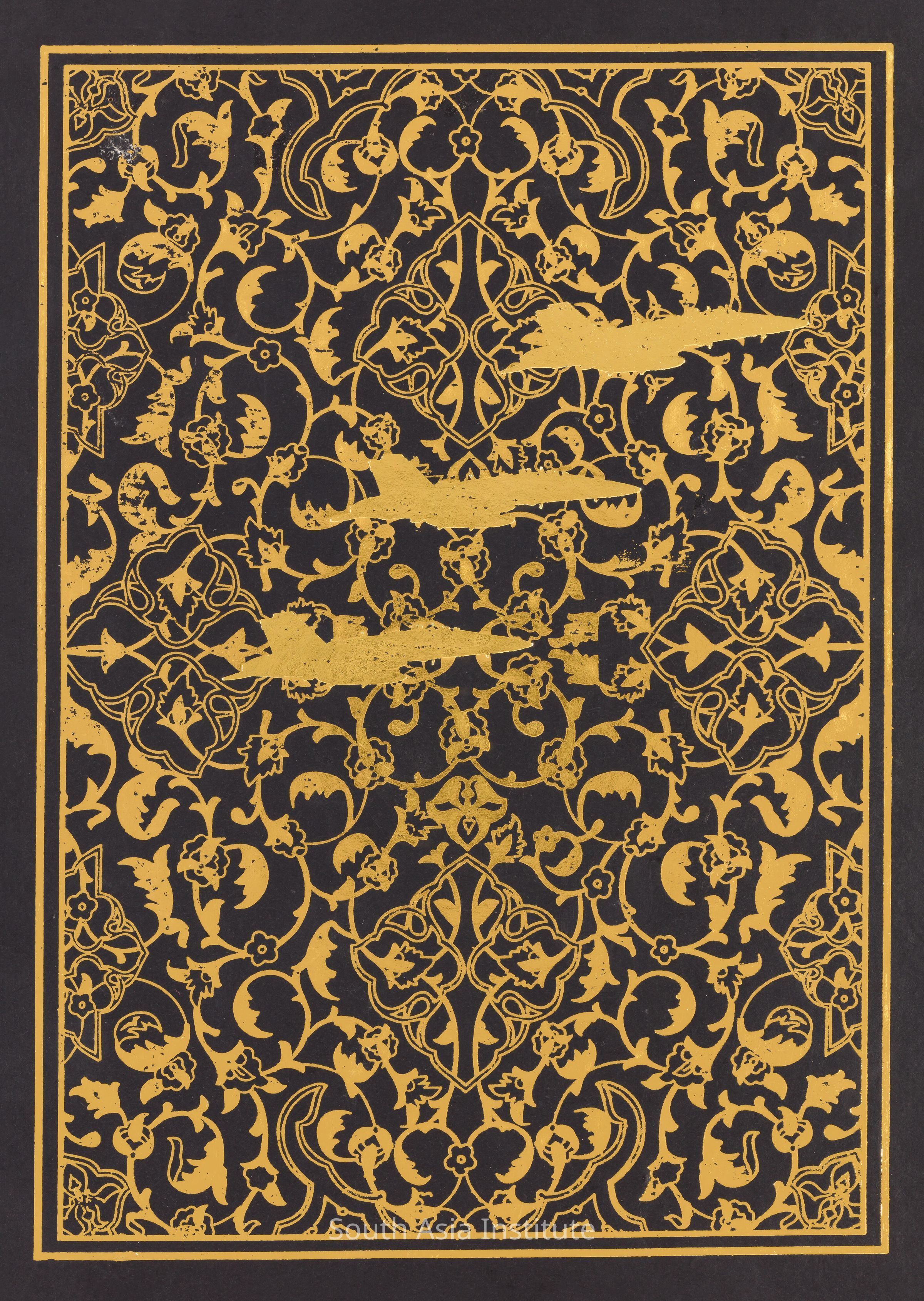 Mudassar is a graduate of the NCA in Lahore. He makes reference to the emotional effects of the geopolitical situation and religious sectarian violence in his book covers, by superimposing his gilded patterns with Cobra helicopters and jet fighters. He has inserted a human heart in the center, to point to the connection between life and death amid the violence.