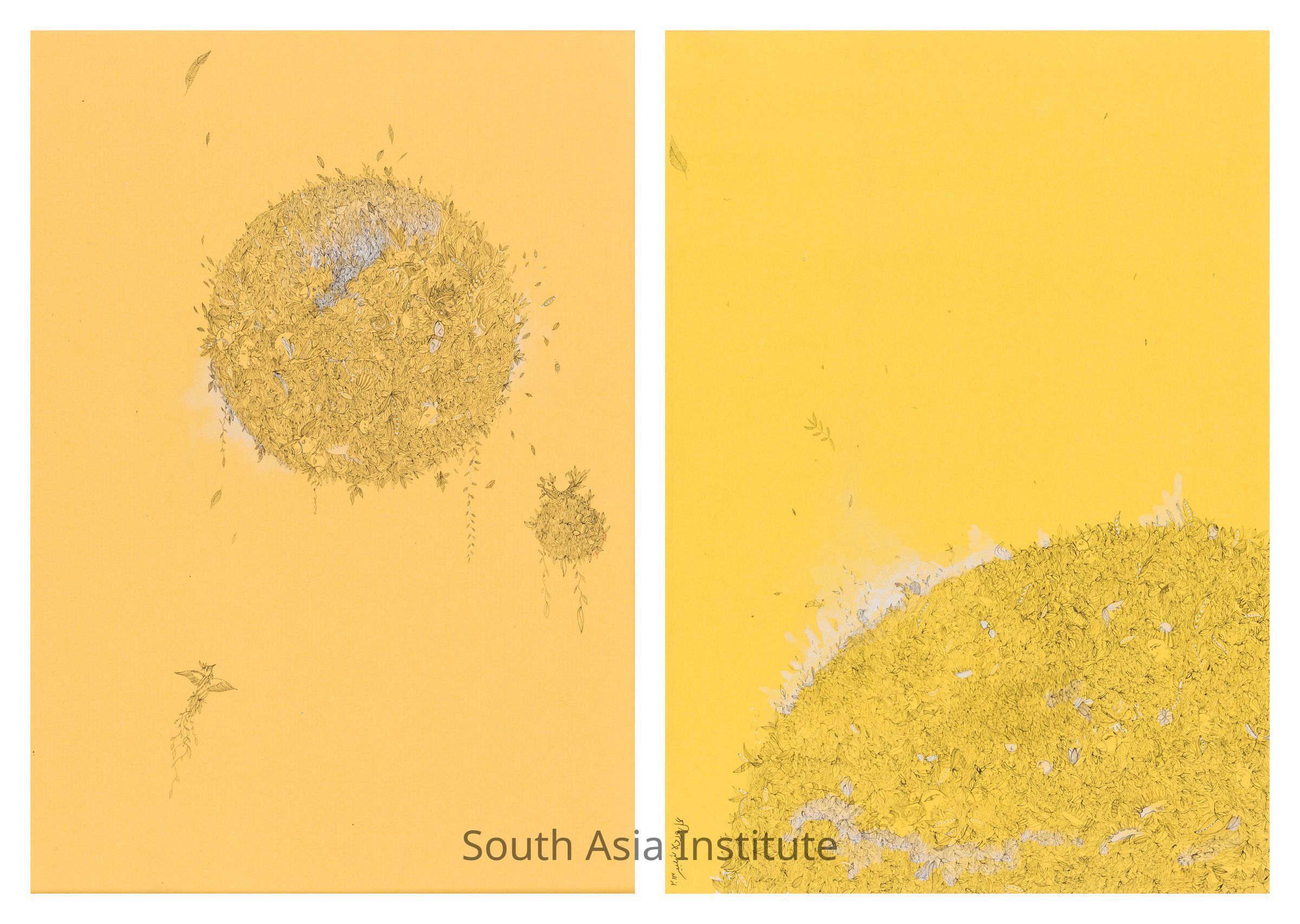 Shabbir graduated from the NCA, Lahore. Her paintings, often incorporate a circle as the center of the composition – a symbol of perfection in both Islamic art and architecture as well as in the works of Western minimalists. The overwhelming presence of nature provokes questions related to the consumerism and technologic progress of today’s world.