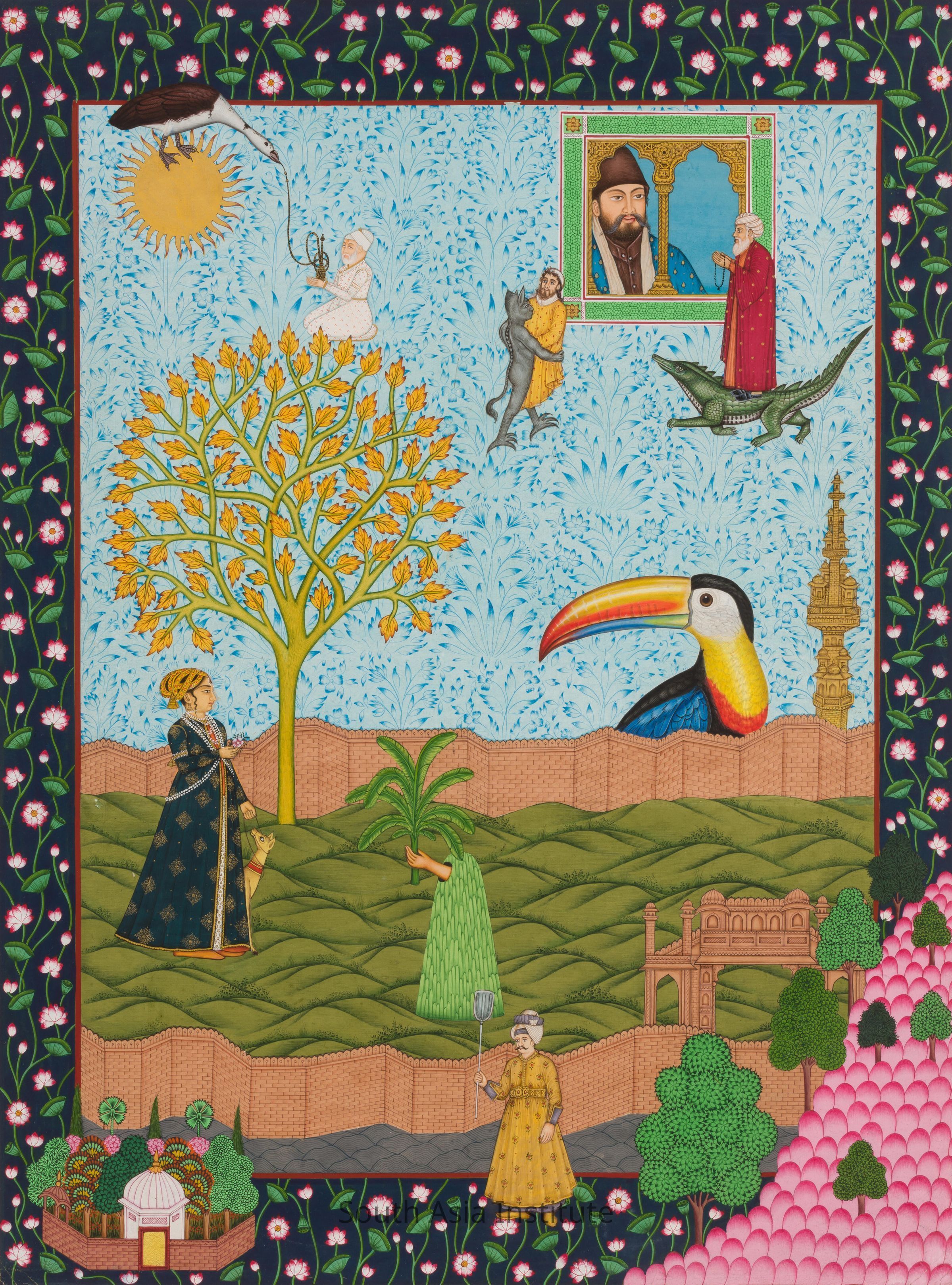 A British artist who graduated from Slade School of Fine Art, London, Gorlizki lives and works in New York. In the mid 1999’s he established an atelier in Jaipur, India, in collaboration with Riyaz Uddin, a miniature artist – a transglobal dialogue that mimics the Mughal court ateliers. Gorlizki focuses on the conceptual drawings in New York while Riyaz and his small team of assistants in Jaipur apply the pigments and gold leaf. Together they re-contextualize the genre of miniature painting using elements of whimsy, fantasy, and a bit of surrealism.