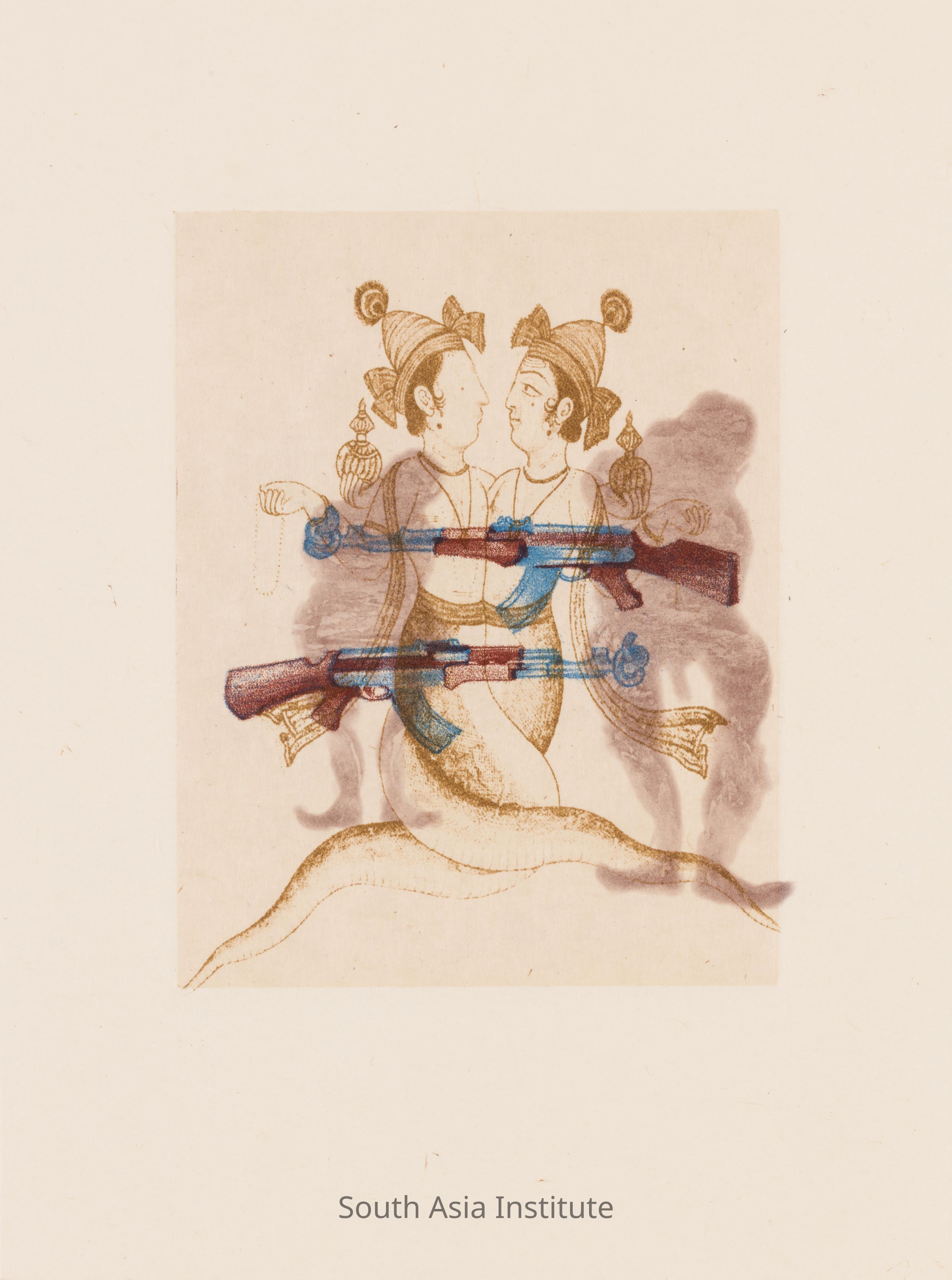Two archaic figures hold rifles with barrels tied in knots: These two works reflect her deeply troubled state following 9/11, when Muslims in the US, were being scrutinized treated with suspicion.