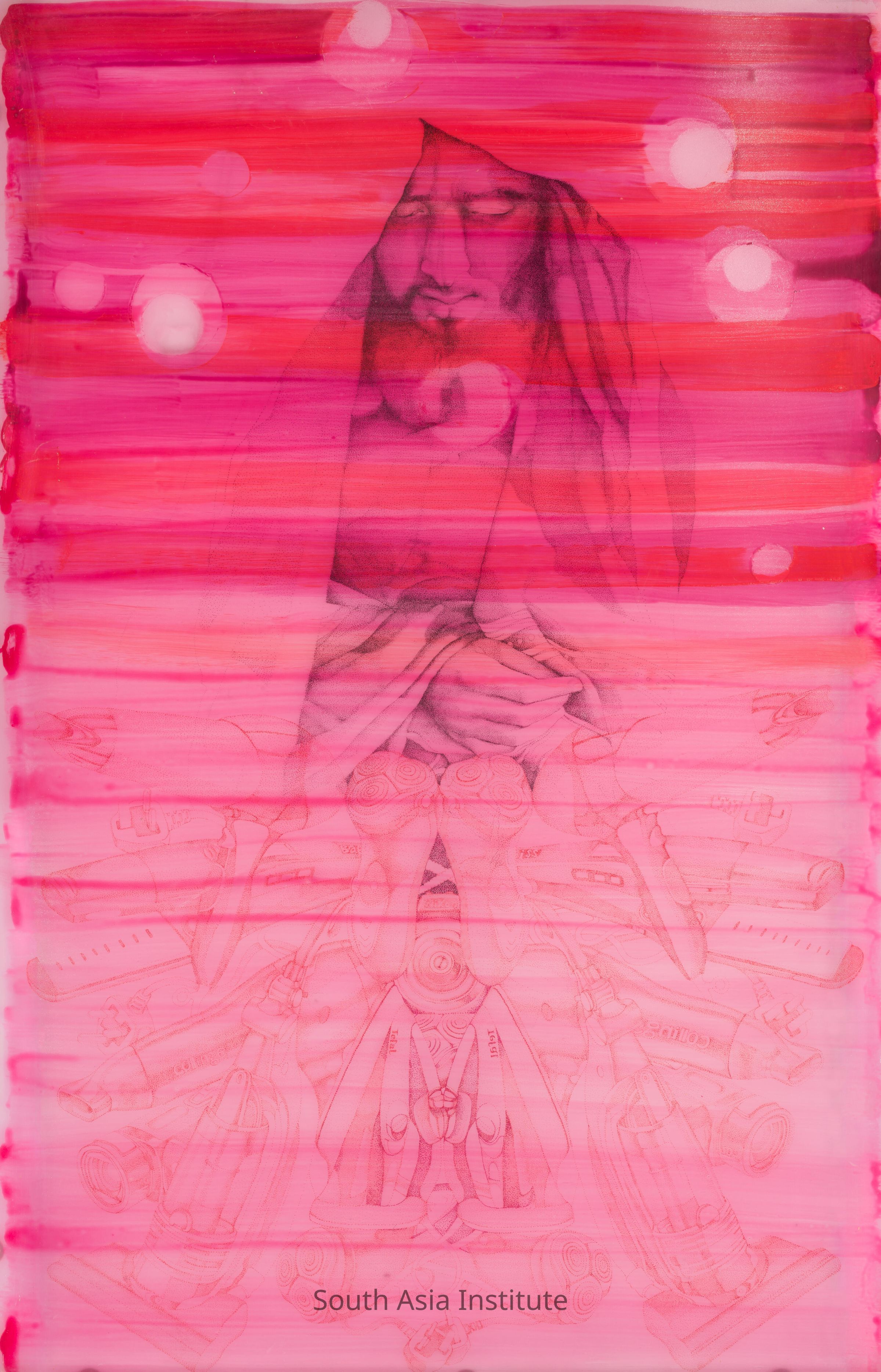 The artist presents the classical hyper-masculine representation of the male in Western art, as a symbol of heroism and power. She responds with these radical images of three contemporary boxers, jutting out of cakes, like trophies. The clothed central figure portrays another common male image, that of the religious men who profess to be the saviors of faith.