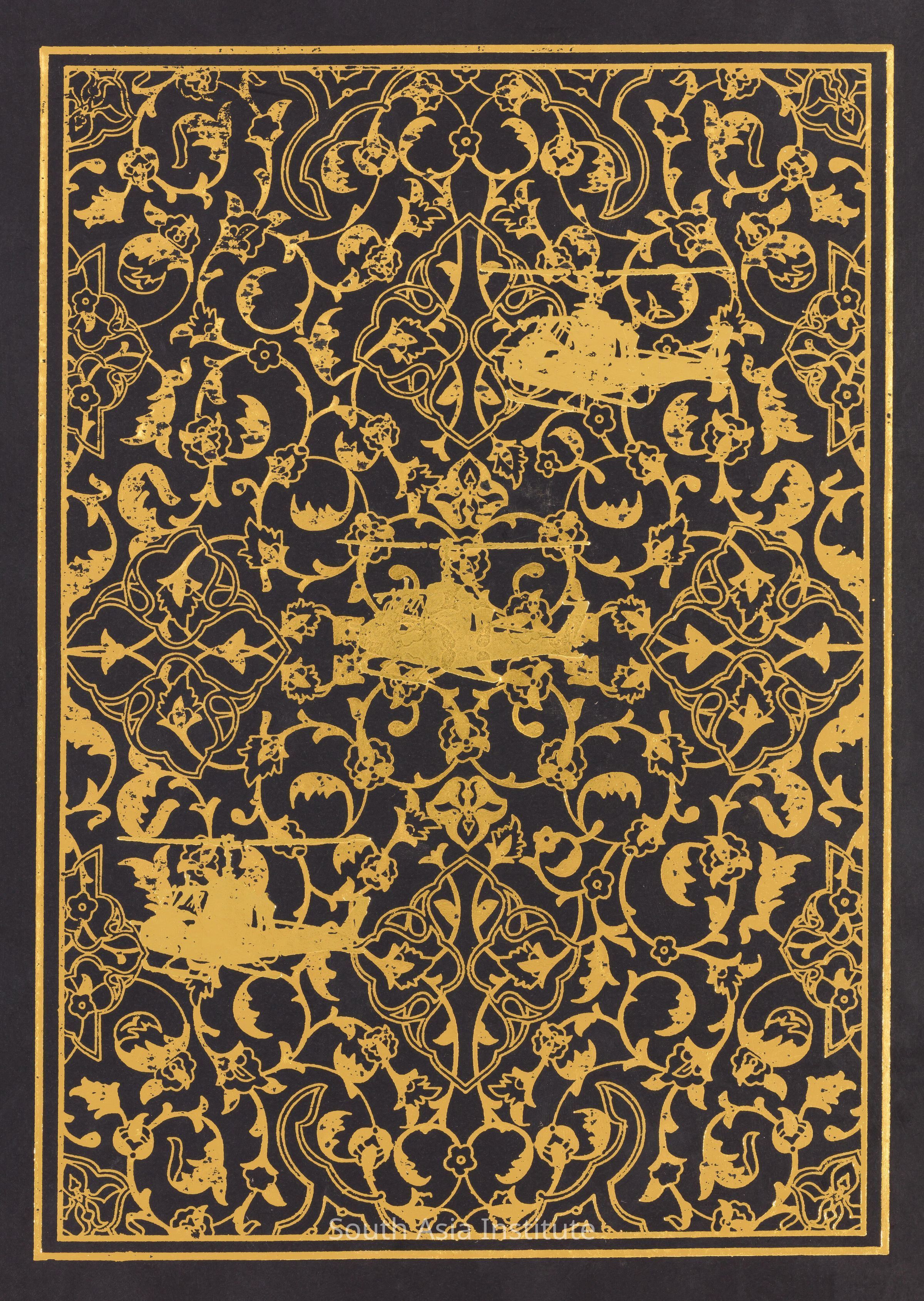 Mudassar is a graduate of the NCA in Lahore. He makes reference to the emotional effects of the geopolitical situation and religious sectarian violence in his book covers, by superimposing his gilded patterns with Cobra helicopters and jet fighters. He has inserted a human heart in the center, to point to the connection between life and death amid the violence.