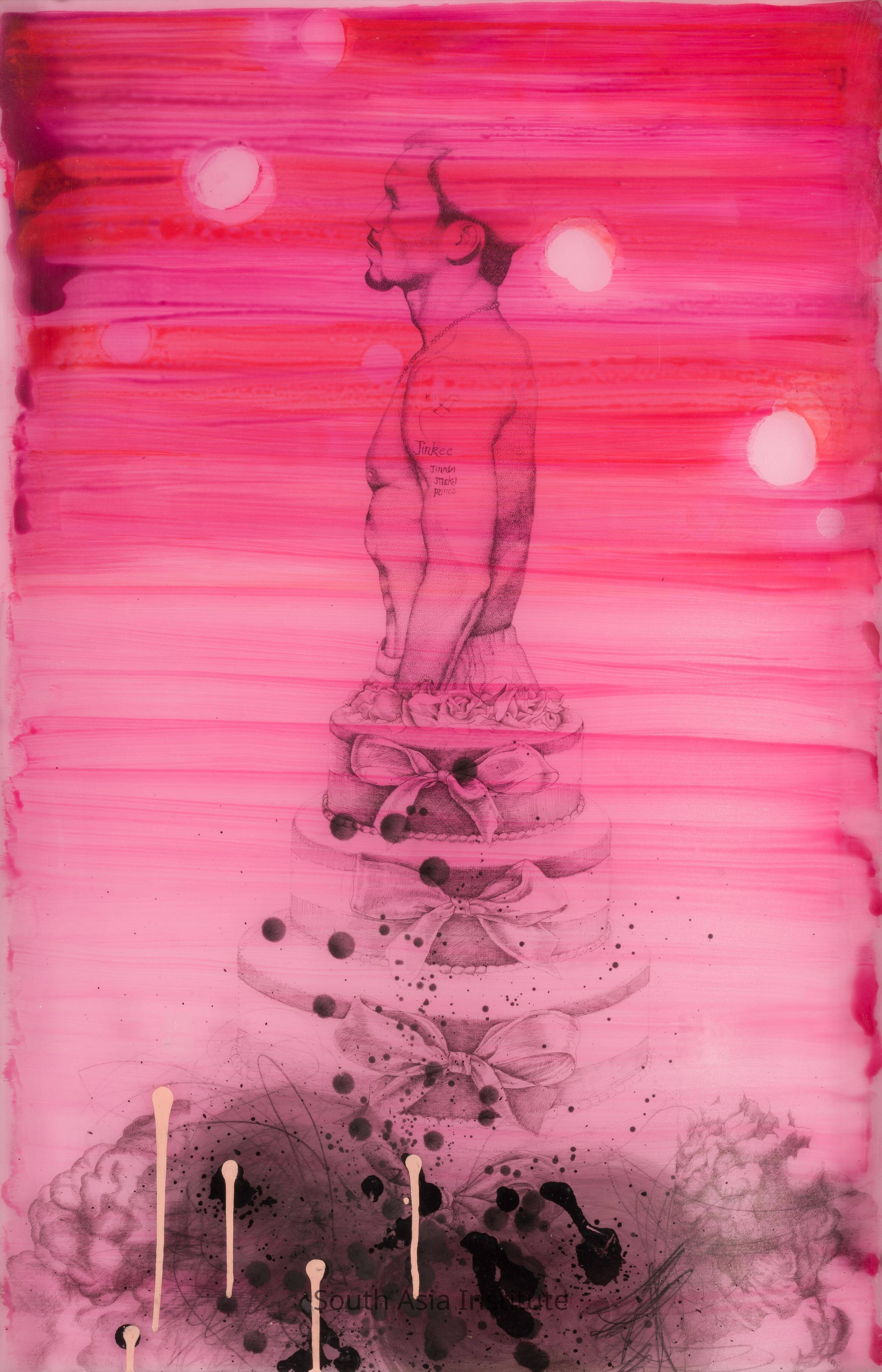 The artist presents the classical hyper-masculine representation of the male in Western art, as a symbol of heroism and power. She responds with these radical images of three contemporary boxers, jutting out of cakes, like trophies. The clothed central figure portrays another common male image, that of the religious men who profess to be the saviors of faith.