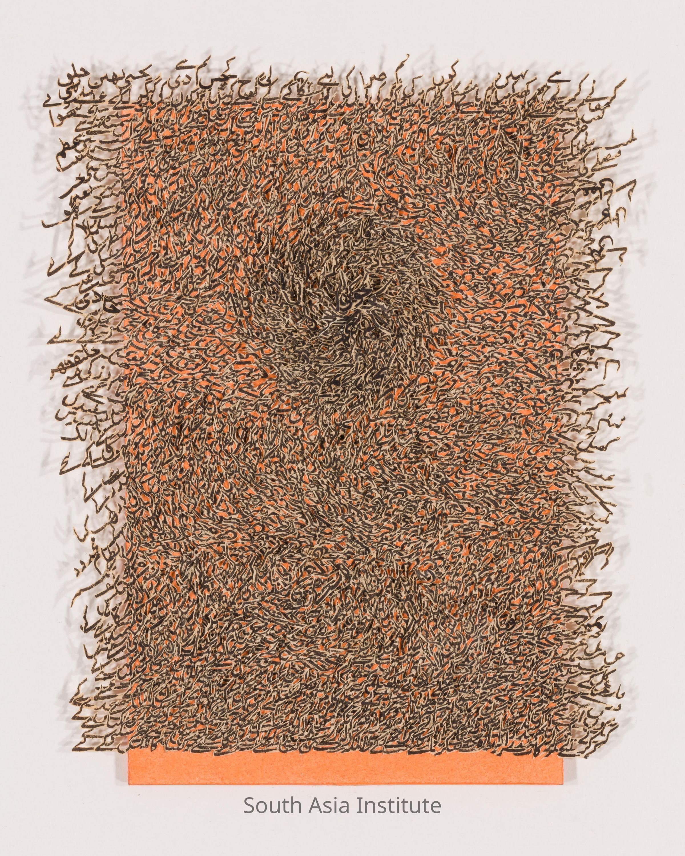 A Pakistani artist who catapulted to international prominence in 2016 when he was the first artist from that country to win the coveted Jameel Prize, awarded by The Victoria & Albert Museum, London. GM as he is known, creates incredibly delicate collage works that are assemblages of Urdu letters painstakingly cut from secondhand books bought in the markets of Lahore. For him carving out words and recomposing them has a cathartic effect. He speaks five languages and is fascinated with language that creates boundaries that limit communication. By freeing up language from the page and attempting to reconstruct it, he strives to enrich it with a new aesthetic meaning.