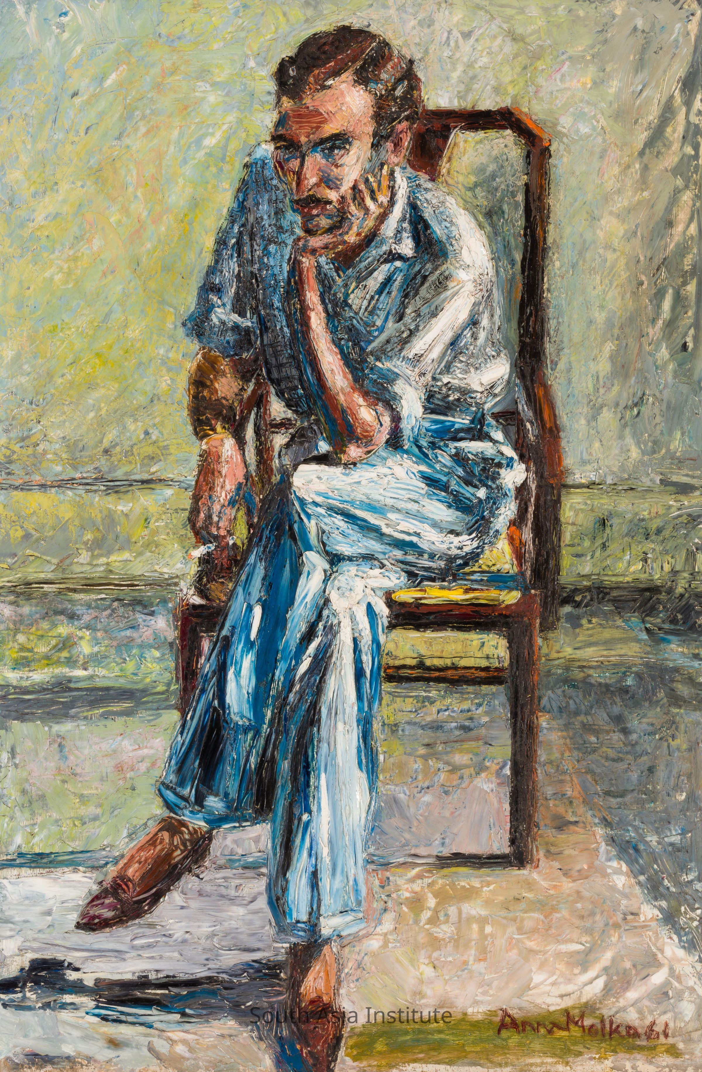 One of the few Europeans to make a successful career in Pakistan, A. M. Ahmed used a palette knife to create heavy impastos in her many portraits of local aesthetes. Here she depicts Sufi Waqar, a renowned poet, in a thoughtful pose.