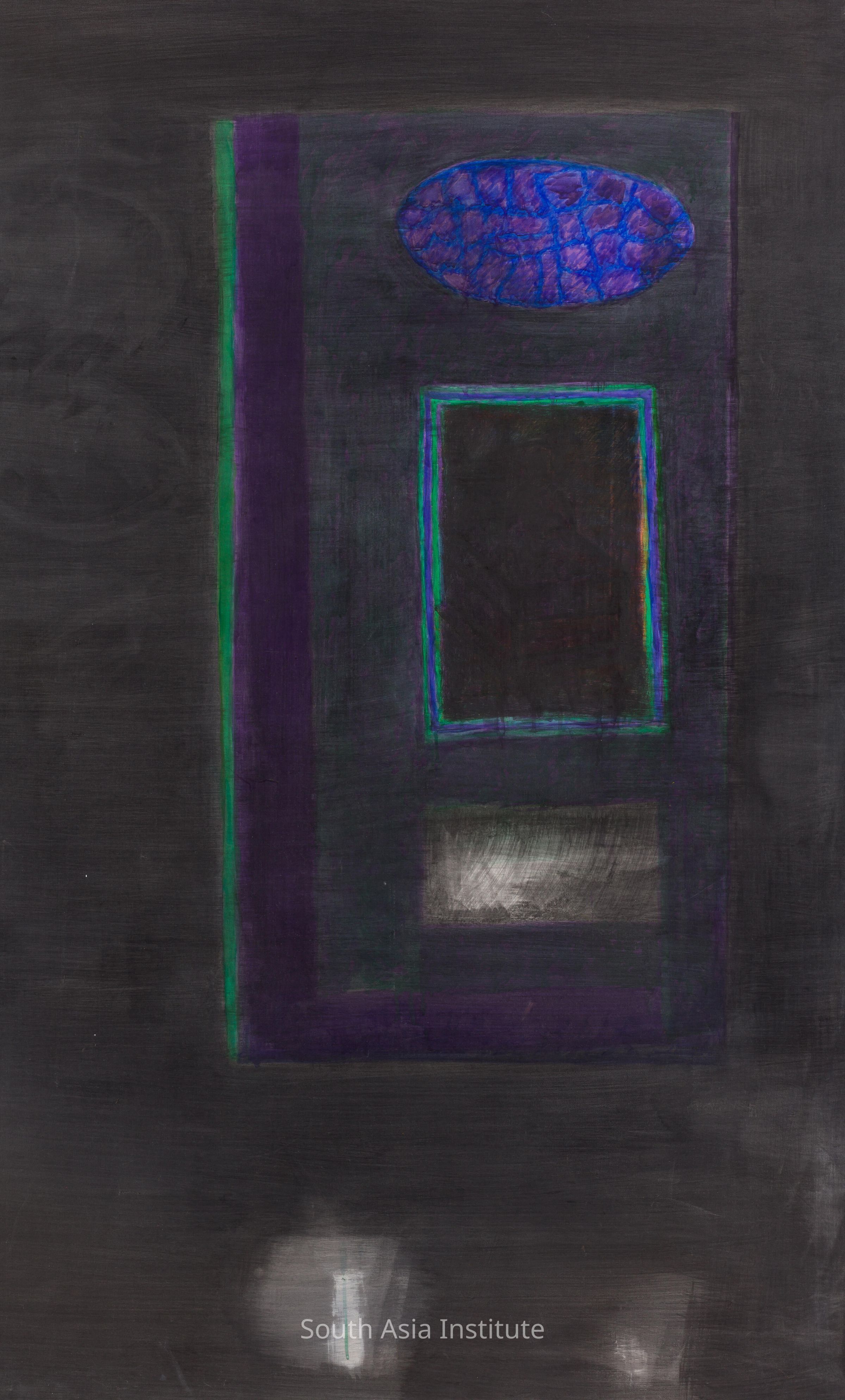 Akhlaq wanted to combine traditional Islamic art and philosophy with modernist aesthetic. He has reconfigured the Islamic manuscript page: note that the rectangle is unevenly spaced on the page, and he has incorporated contemporary personal imagery into the interior space. His invention was followed by many of his students and other Pakistani painters.