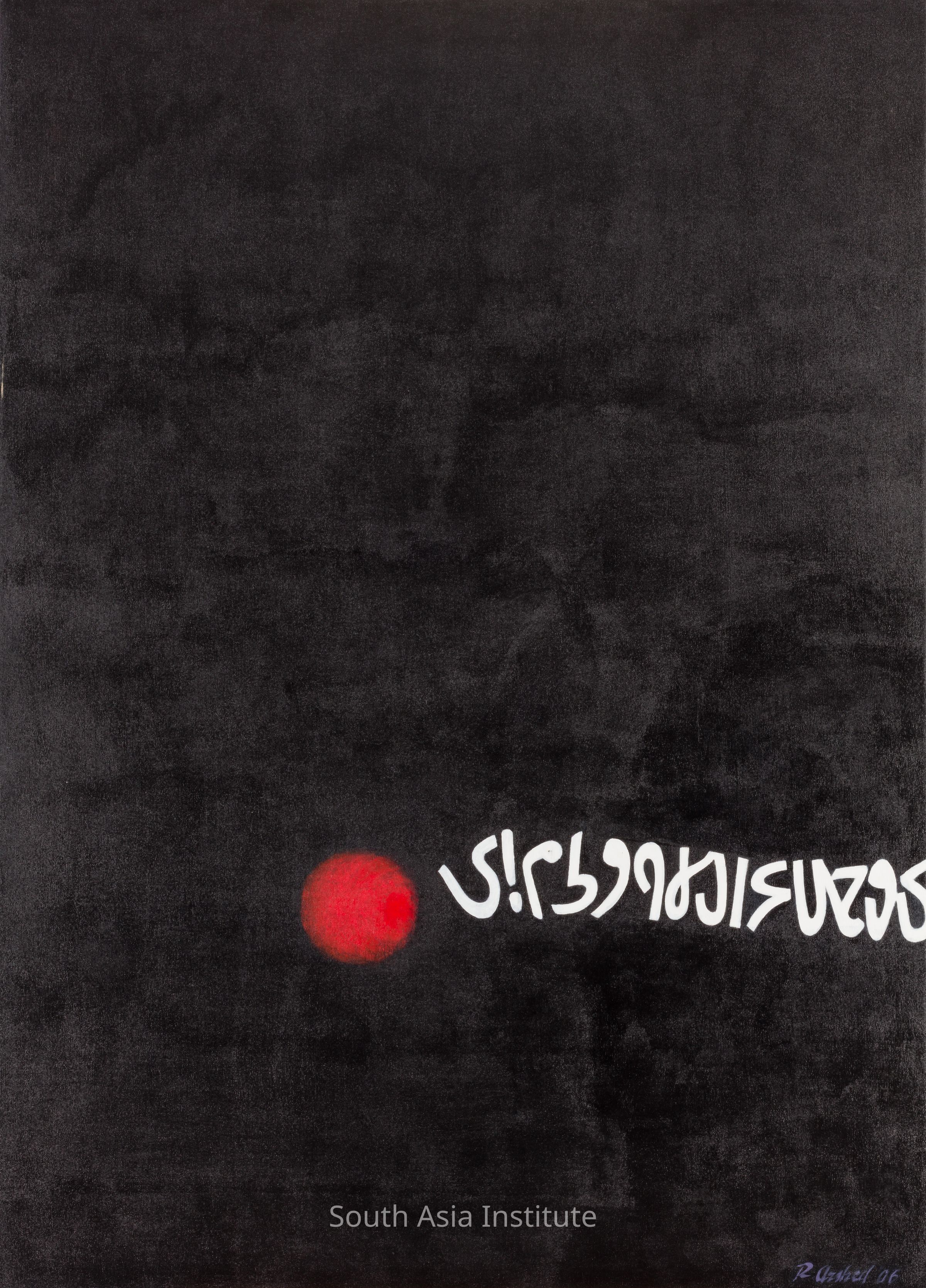 The dramatic entrance of white script almost touching the red globe makes a striking impression against the black background. While the script has no specific identity, the red dot derives from accent marks in Arabic writing.