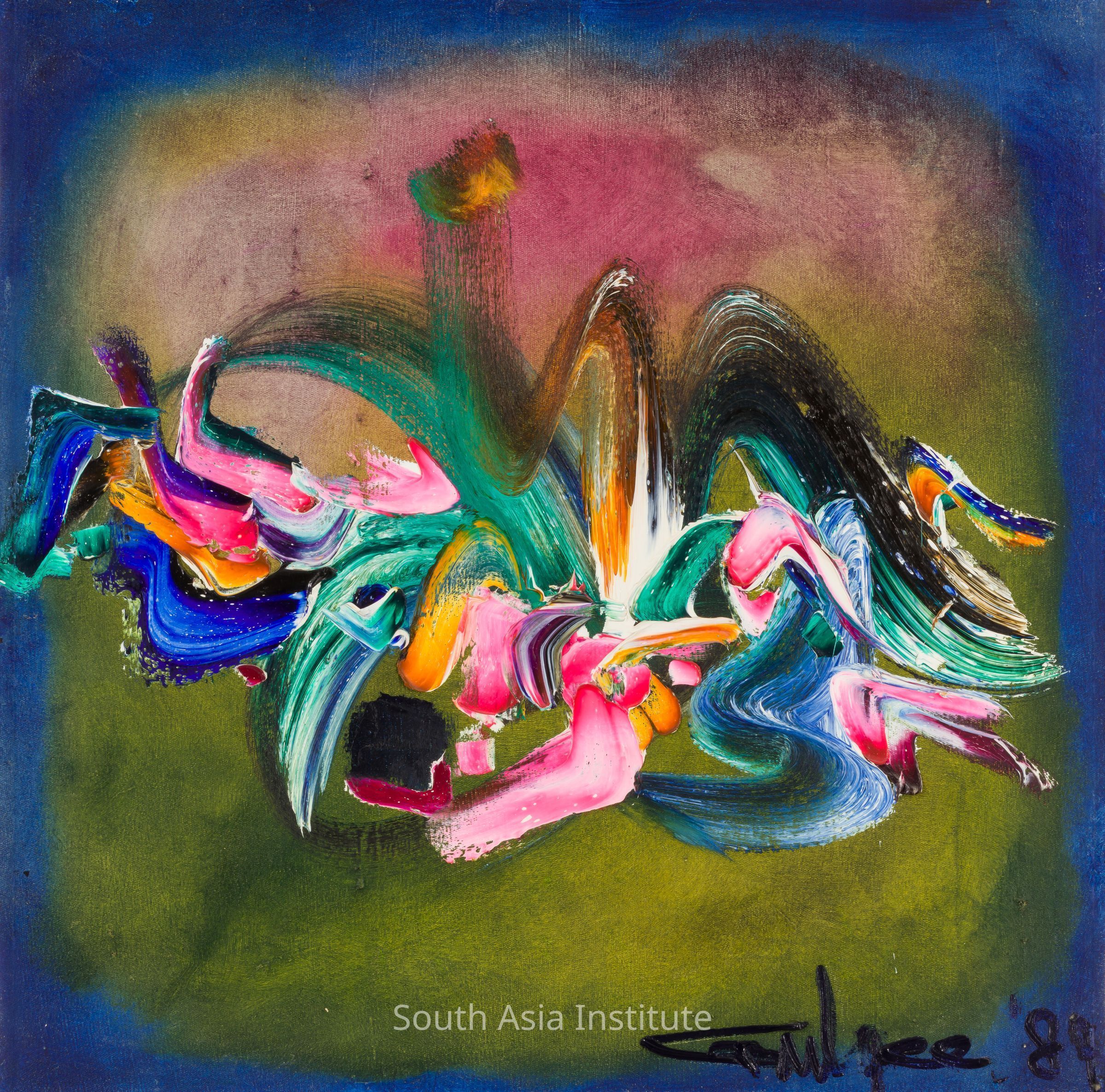 Not satisfied with his position as design engineer in Stockholm, after earning an M A in hydraulics from Columbia University and another in soil mechanics from Harvard, Gulgee returned to Pakistan to begin a career in art. Lauded for his immaculate draftsmanship he gained fame as a painter of portraits and horses. His realistic figurative lapis mosaics are unmatched to this day. In 1960, witnessing an exhibition of Abstract Expressionist paintings, he started adapting abstracted calligraphy to Action Painting technique and produced paintings like this one in the Hundal Collection.
