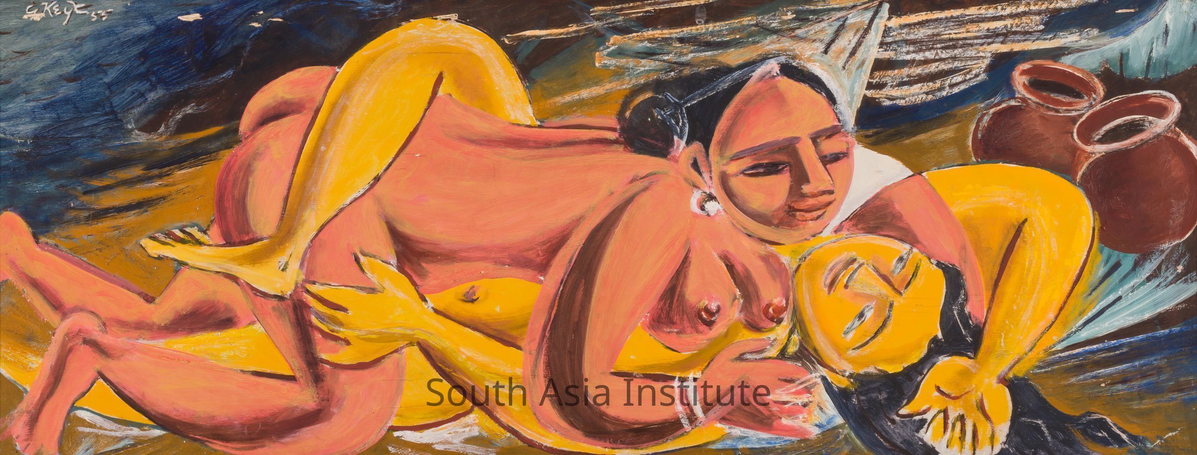 In a style less indicative of Picasso than other paintings in Keyt’s genre, the lovers are reminiscent of erotic paintings from India’s Hindu miniature tradition.