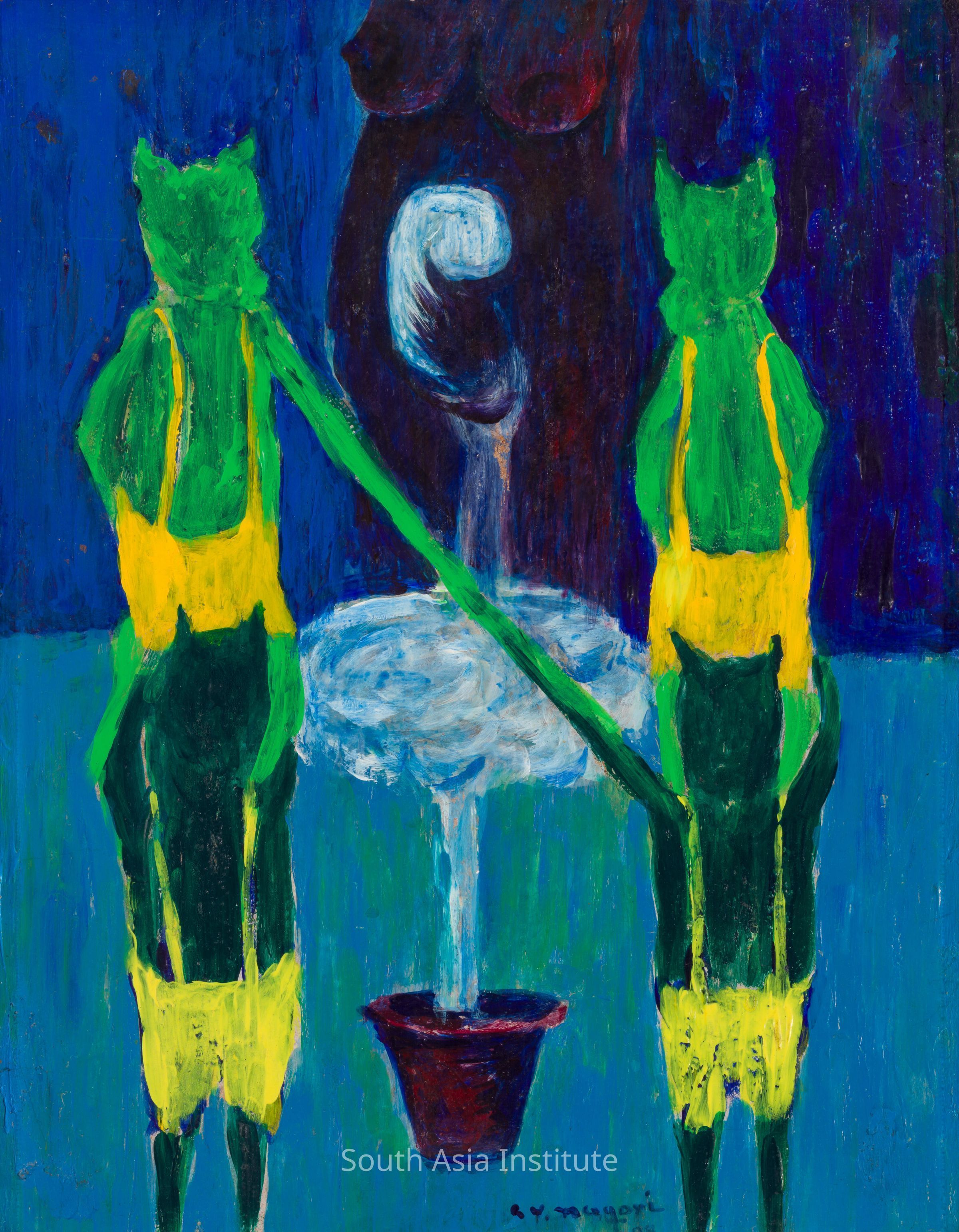 The complex iconography in this brooding painting references an explosion and green evil doers, usually the military or corrupt politicians, possibly in cahoots since here they have joined hands. A large dark female in the background hints at Nagori’s abhorrence for the treatment of women in the orthodox Sindhi culture of southern Pakistan.