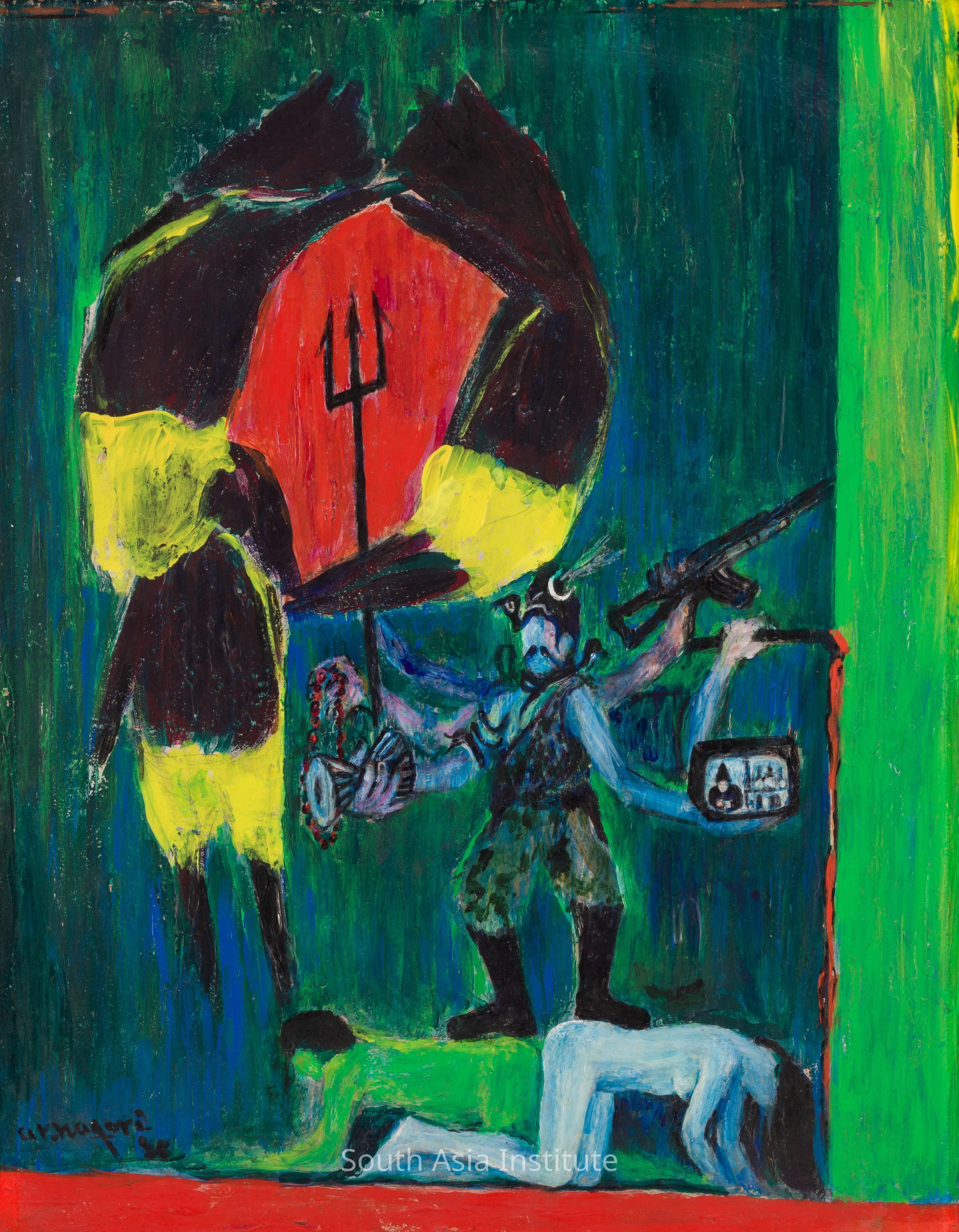 The letter P is a blatant declaration accusing the multifarious Indo-Pakistani factions, men and religion, of the inhumane treatment of women. The multi-armed titan standing on the backs of two women brandishes a Shivite trishula (pitchfork)and drum, a machine gun and TV with image of a mullah.