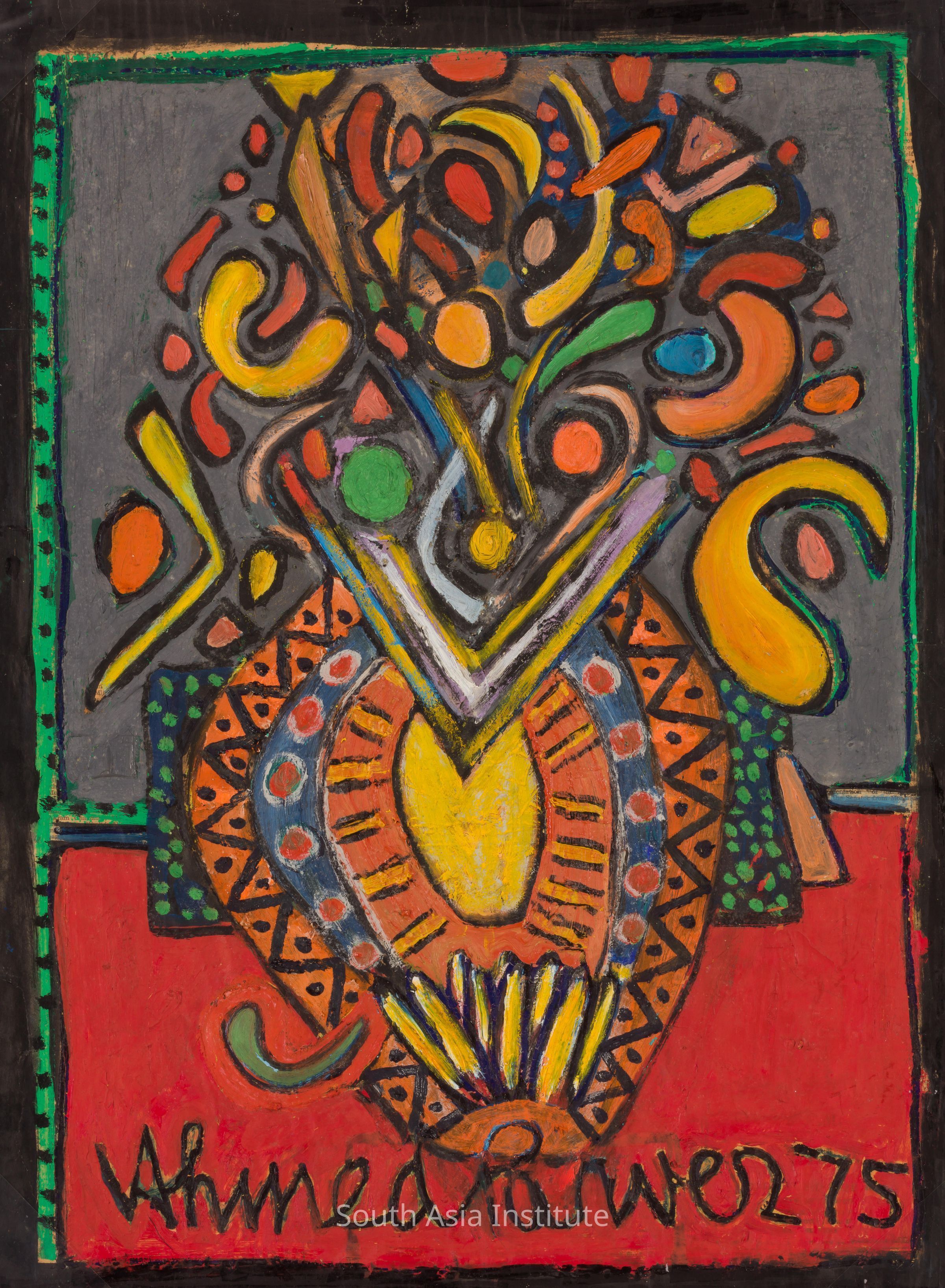 The happy, busy assortment of shapes streaming from the vessel’s mouth is classic Parvez. Bright solid colors typify his 1970s oeuvre. The endless variety of configurations on this motif overcome any need to inquire why no figures.