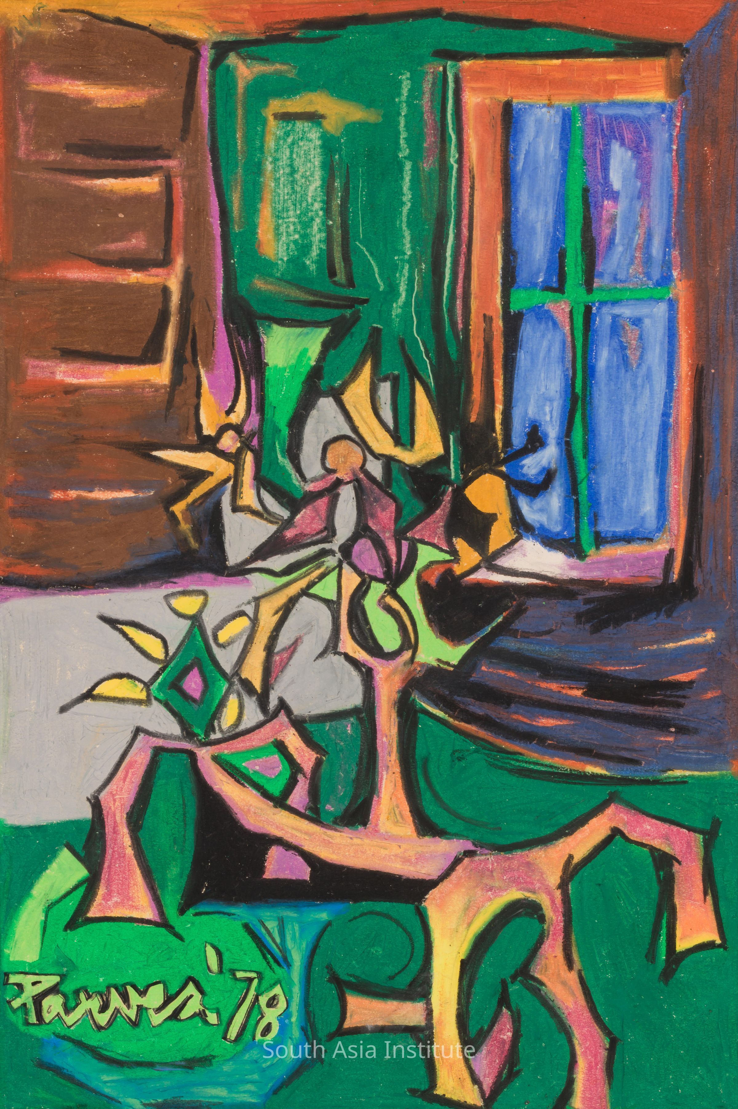 The delineated interior of this painting, circumscribing a prickly still life, is, for Parvez, a rare use of pictorial space. Most of Parvez’s paintings feature a bouquet-like center piece placed against an uncluttered background. His large and prominent signature and date, another recurring characteristic has not, however, been excluded from this unusual work.