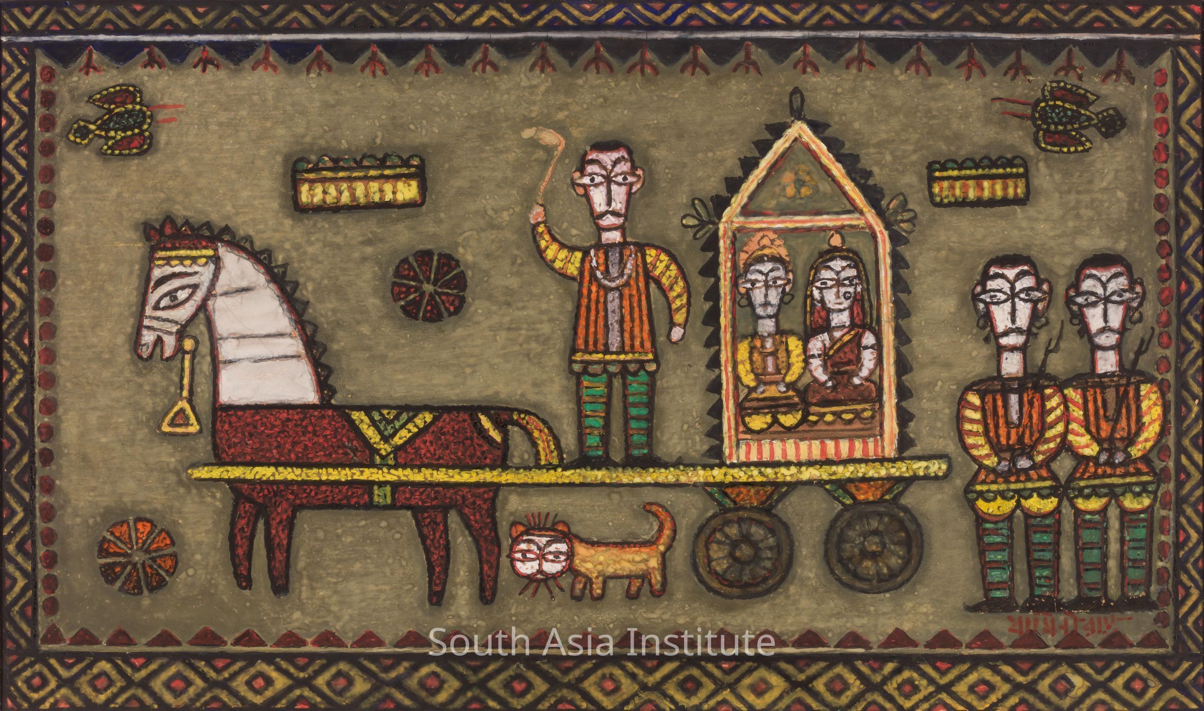 Wedding Procession is an amalgamation of diverse local sources reconfigured into his own inimitable genre. Roy’s two-dimensional compositions and unmodulated color depicting Hindu themes and daily life were, perhaps ironically the touchstone for the modernist movement in India.(M. Sirhandi)