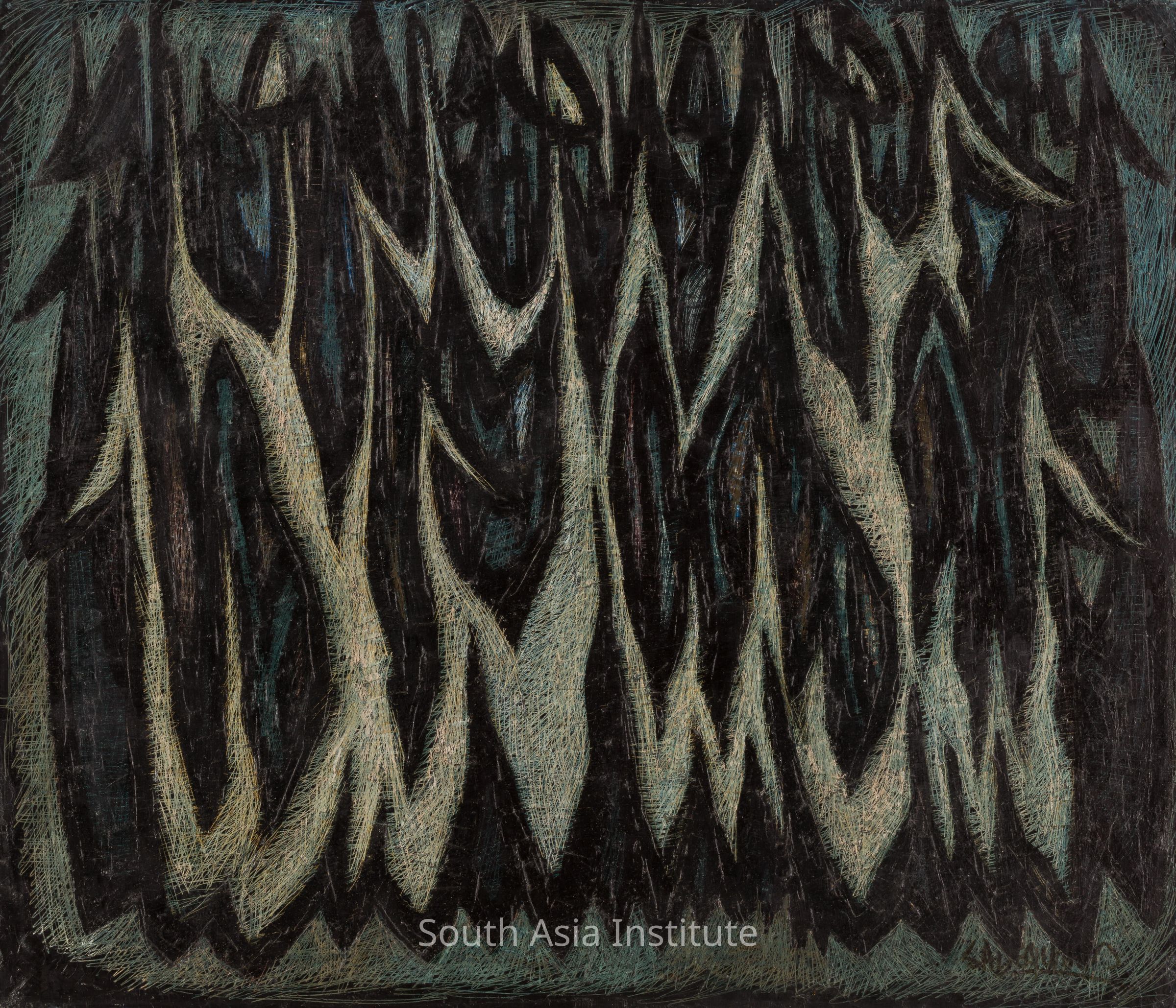 In 1958 Sadequain retreated to Gadani, where he lived alone for months, painting the sea shore and cacti. He called this remote Karachi sea coast his “cactus land”. The painting seen here exemplifies the effects of light and moving shadows that informed his Gadani series. Applicable to this painting as well, the artist visualized and painted imaginary roots shooting up to the sky and taking in energy. The cactus remained a constant motif throughout his career.