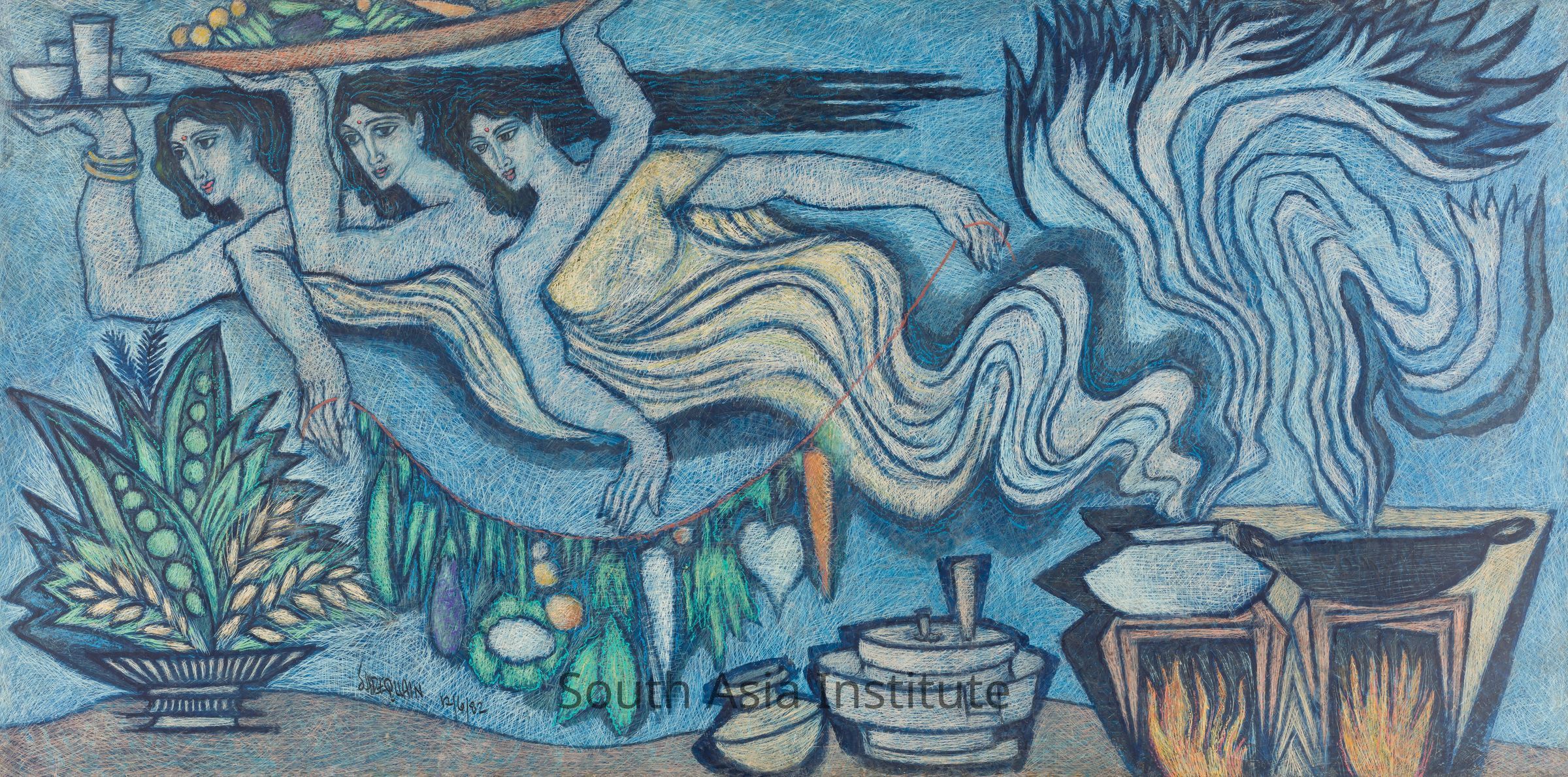 This work was painted while he was working on a mural at the Hindu University in Banaras (Varanasi) and gifted to his assistant, who brought him home cooked meals regularly.