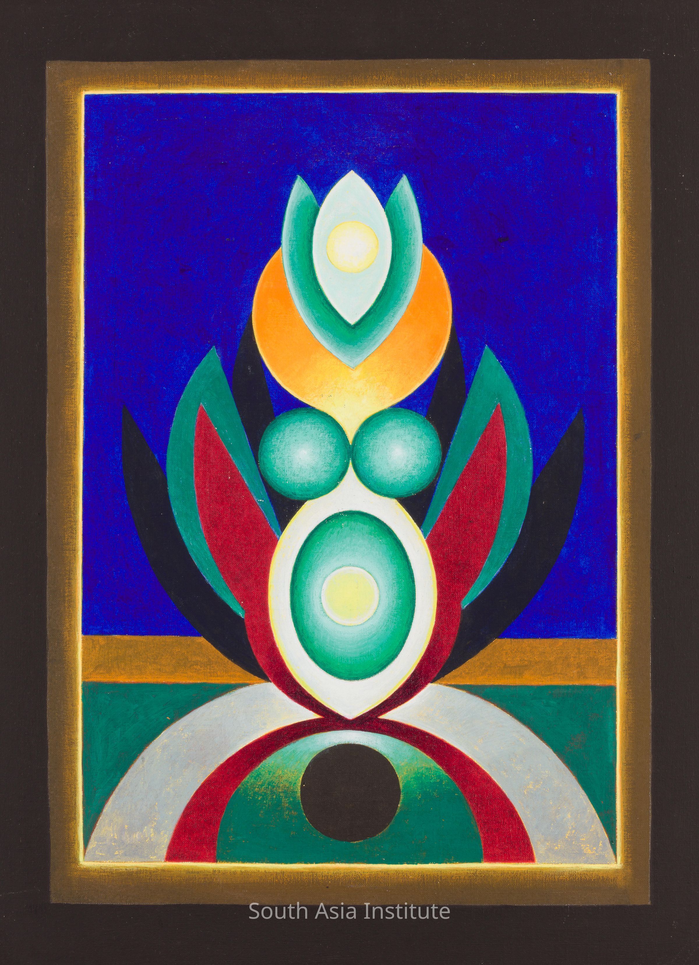 Born to a Muslim Kashmiri family, Santosh was privy to a culture where Hindu and Buddhist Tantric practice mixed almost unperceptively with prevalent Sufi mysticism. His yantra inspired paintings rely heavily on linga and yoni imagery as conceived in Saivite theology. The coming together of male and female is a metaphor for rejoining the universe or achieving moksha, release from the cycles of life. In this painting, the green disks or breasts sit above a womb holding a yellow orb, new life or the sun perhaps.